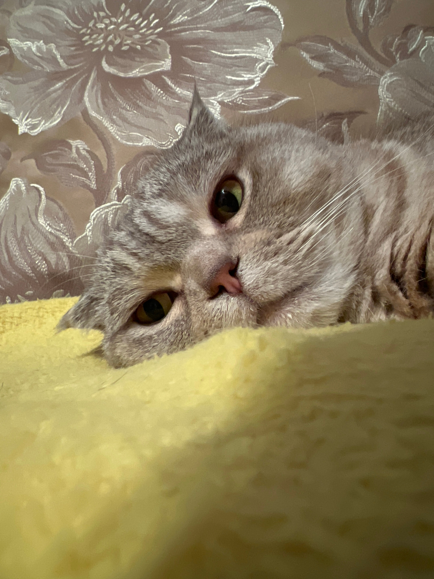 A close-up, slightly low-angle shot features a gray tabby cat partially obscured by a soft yellow object on the left. The cat's head and upper body are visible, with its face bearing a somewhat grumpy…read more