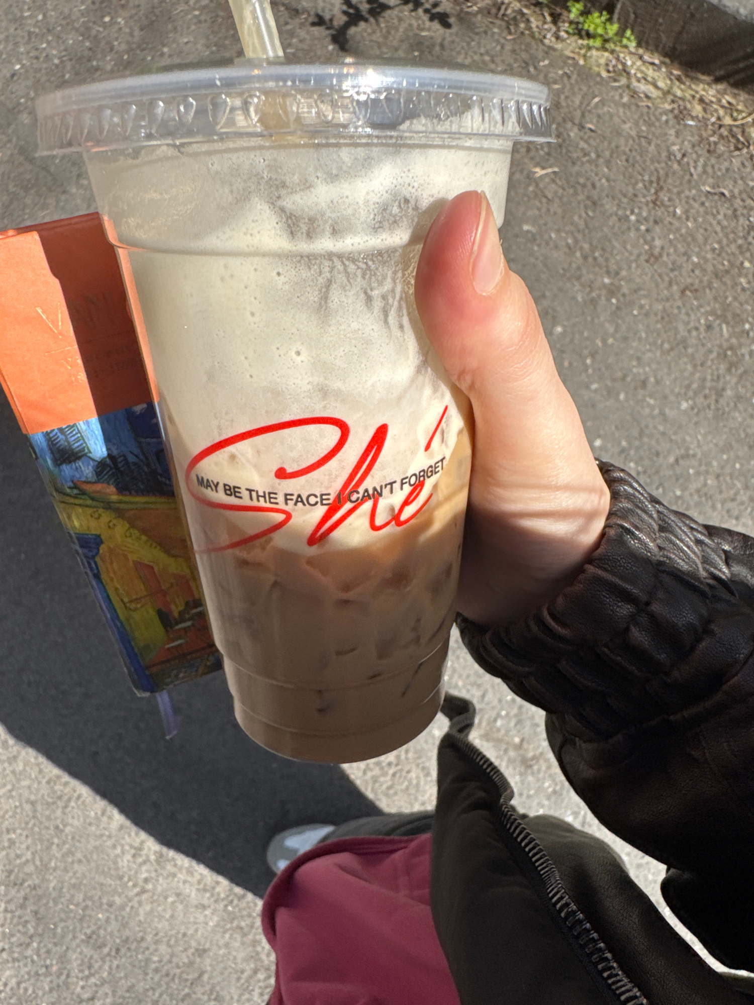 A person is holding a plastic cup of iced coffee with a straw and a clear lid. The cup has red lettering that says "Maybe the face I can't forget." The cup rests on top of a book with an orange cover…read more