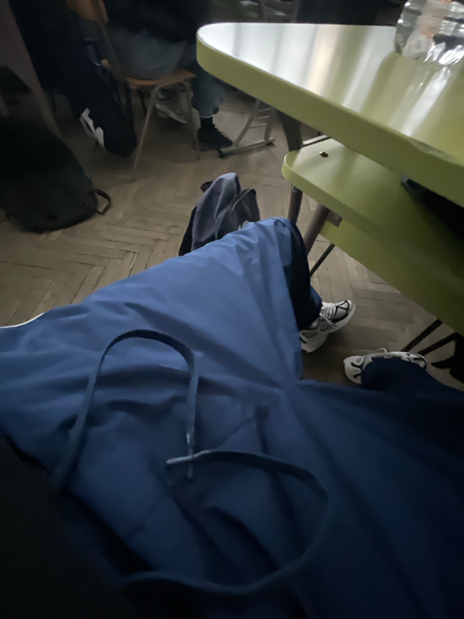The image shows an overhead view of a scene with multiple elements. A light-yellow table with a white top occupies the upper left. A person wearing white and grey sneakers is partially visible. Part o…read more