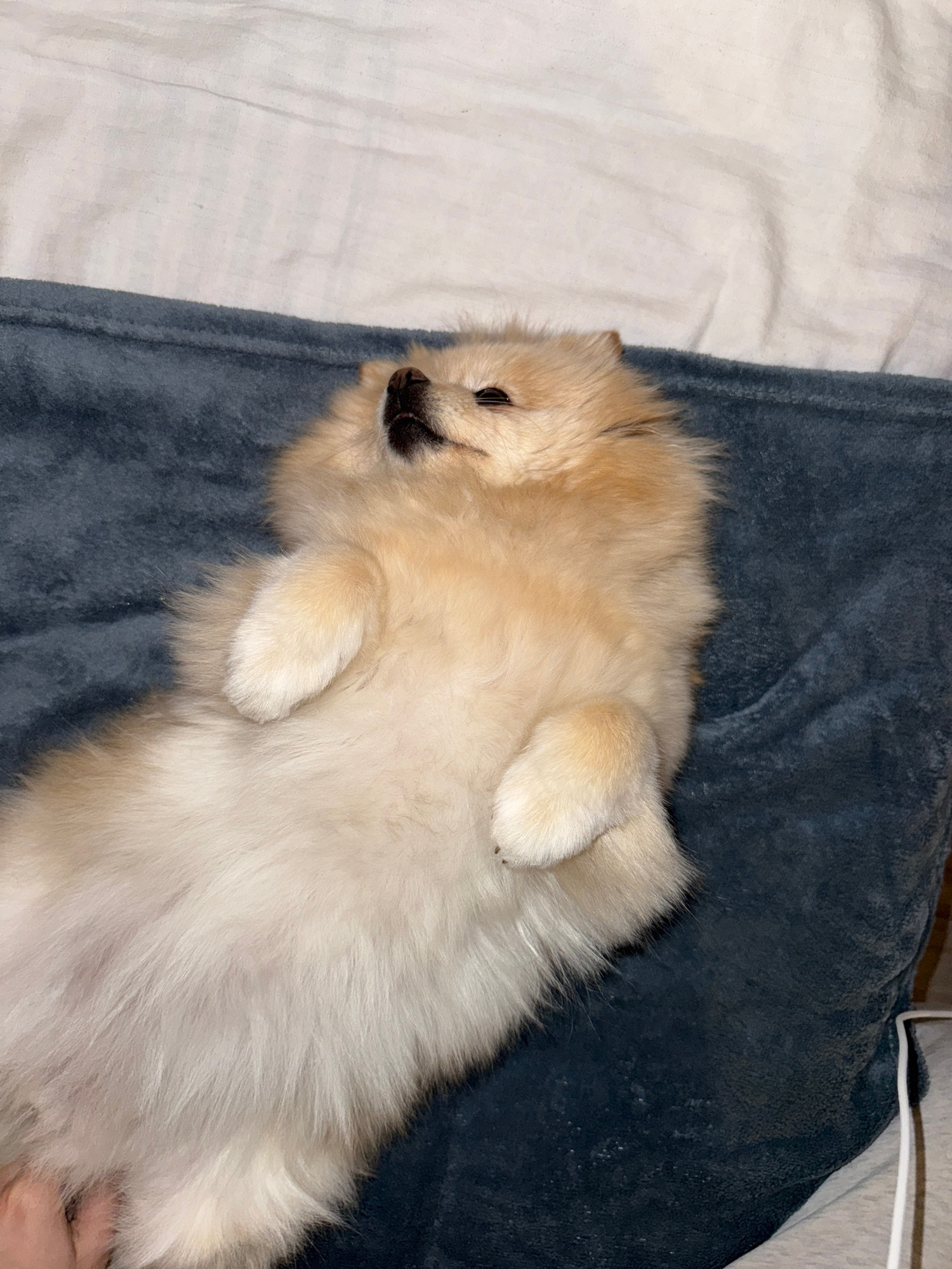 A light-colored Pomeranian dog is lying on its back on a blue blanket, with its paws curled up. The blanket is adjacent to a white sheet. The scene appears to be indoors. The location is not discernible from the image. | Open Wire