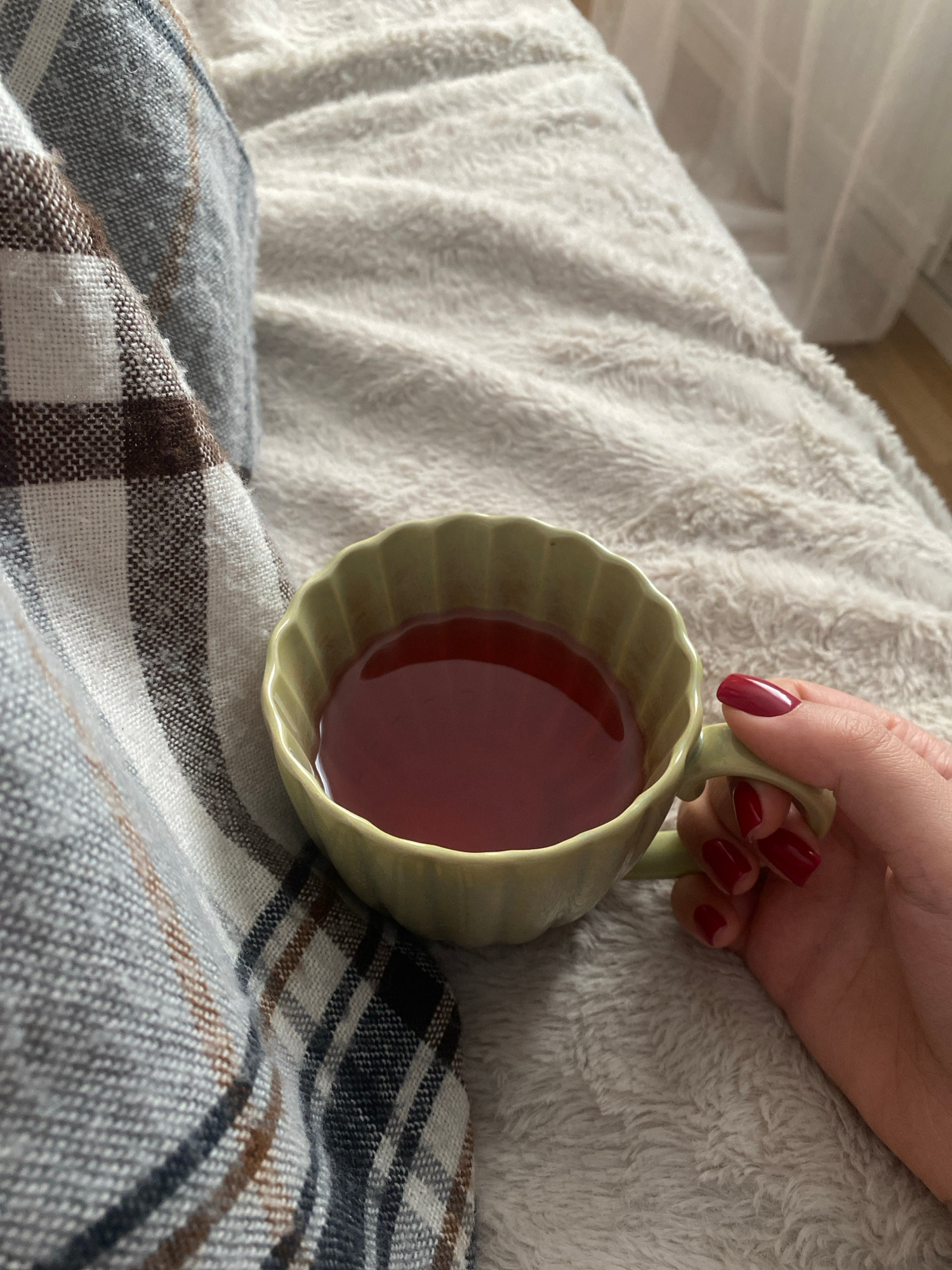 A hand with red nails holds a light green mug filled with a reddish-brown liquid, presumably tea or coffee. The mug is resting on a plaid blanket with a mix of grey, white, and brown squares. A fluffy…read more