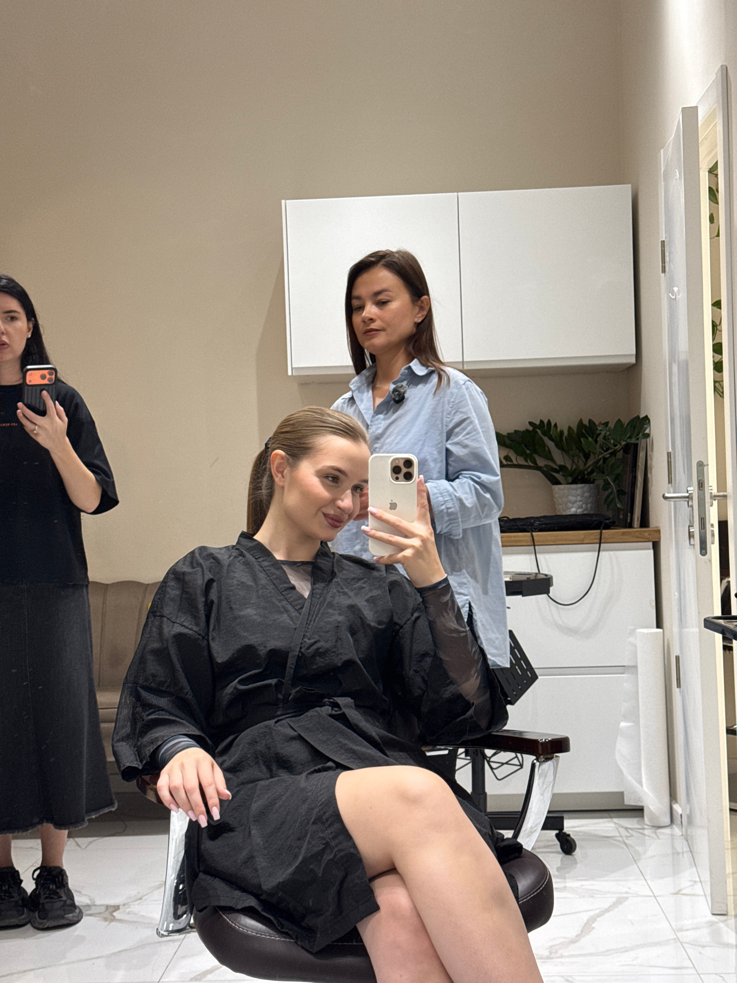 The image depicts a vibrant scene inside a modern hair salon in Budva, Montenegro. Three women are present in the brightly lit interior. In the foreground, a client, a young woman with her hair pulle…read more