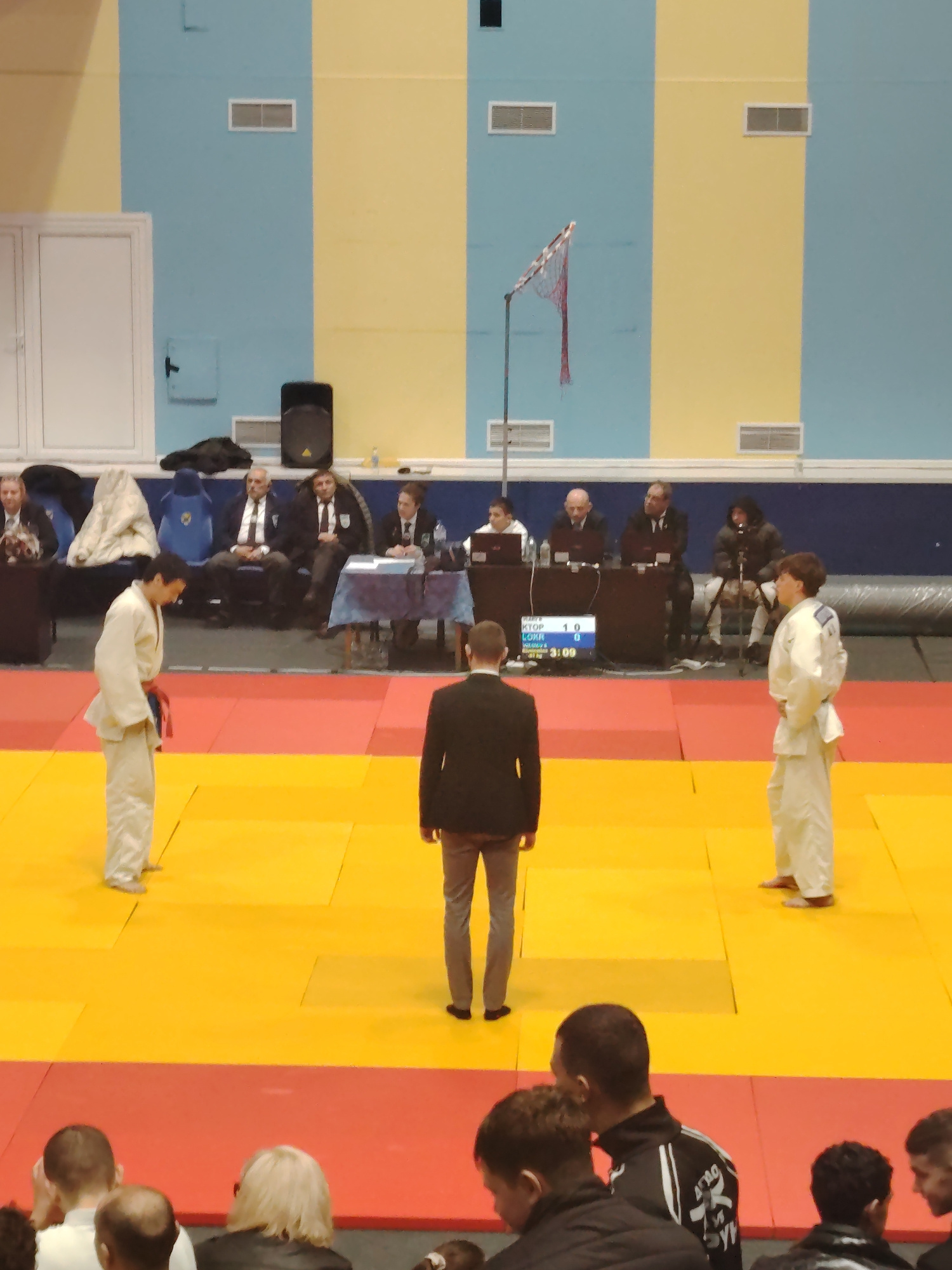 The image captures a judo competition, likely in Pazardzhik, Bulgaria, based on information displayed on the scoreboard and visible inscriptions (e.g. "KTOP" which could refer to a local sports team/o…read more