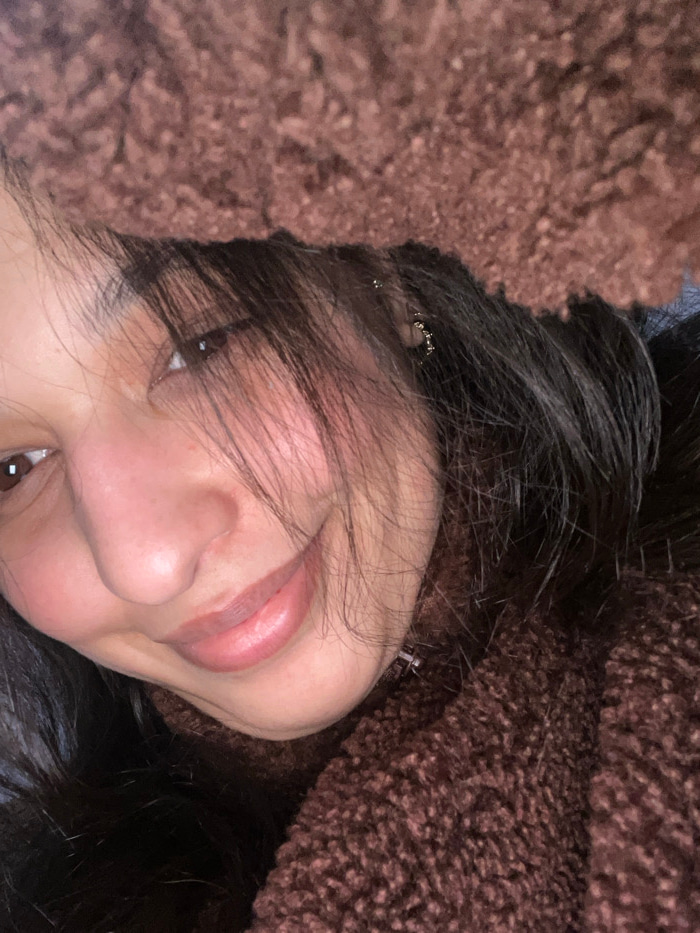 A young woman with dark hair is positioned at an angle, her face turned towards the camera. Her lips are slightly parted, and one eye is visible, reflecting light. The skin has a smooth texture. Arounβ¦read more