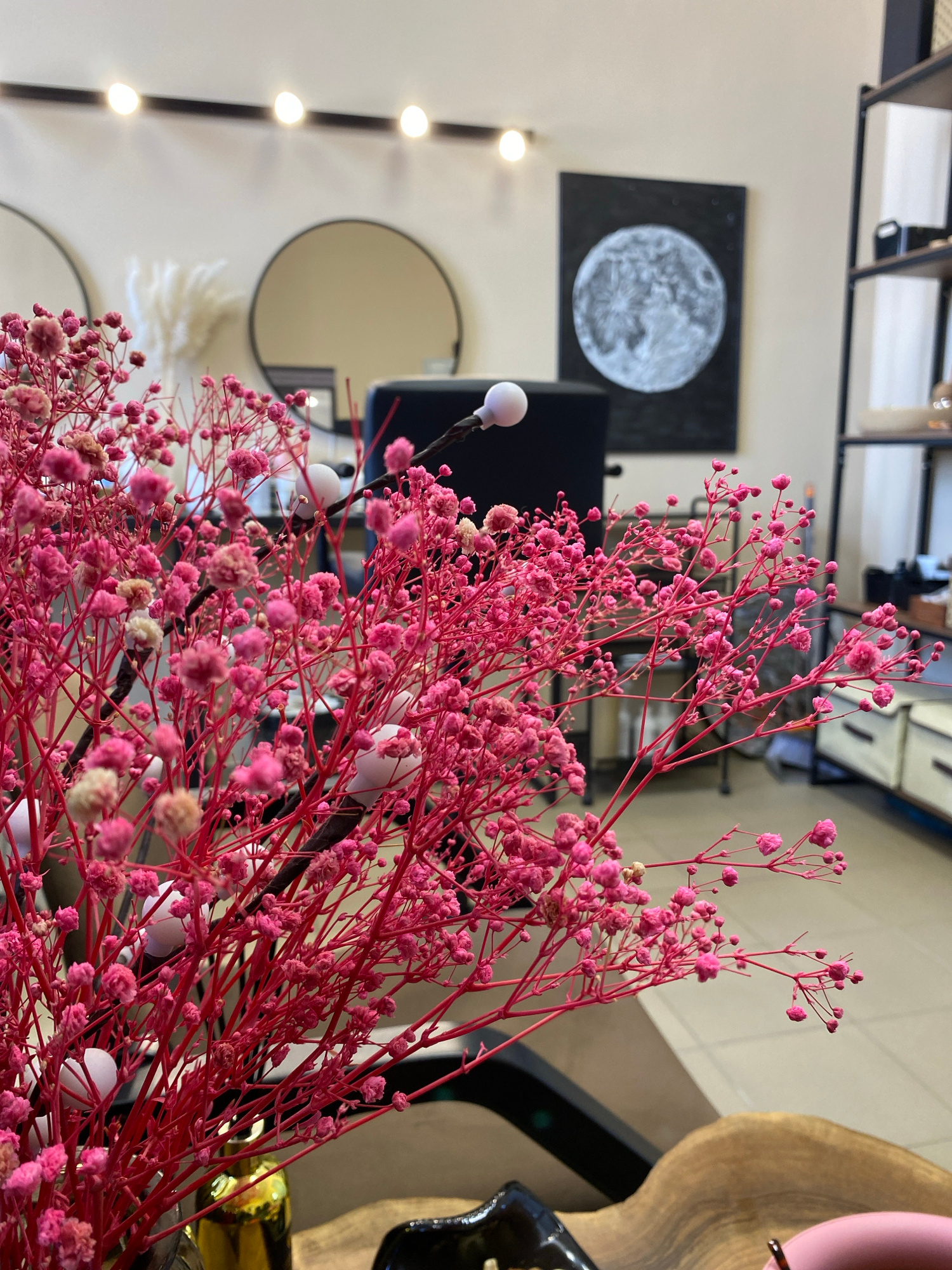 A close-up, interior shot depicts a pink, dried flower arrangement with red stems, potentially gypsophila. The arrangement also contains some small, white, spherical decorations. The background includ…read more