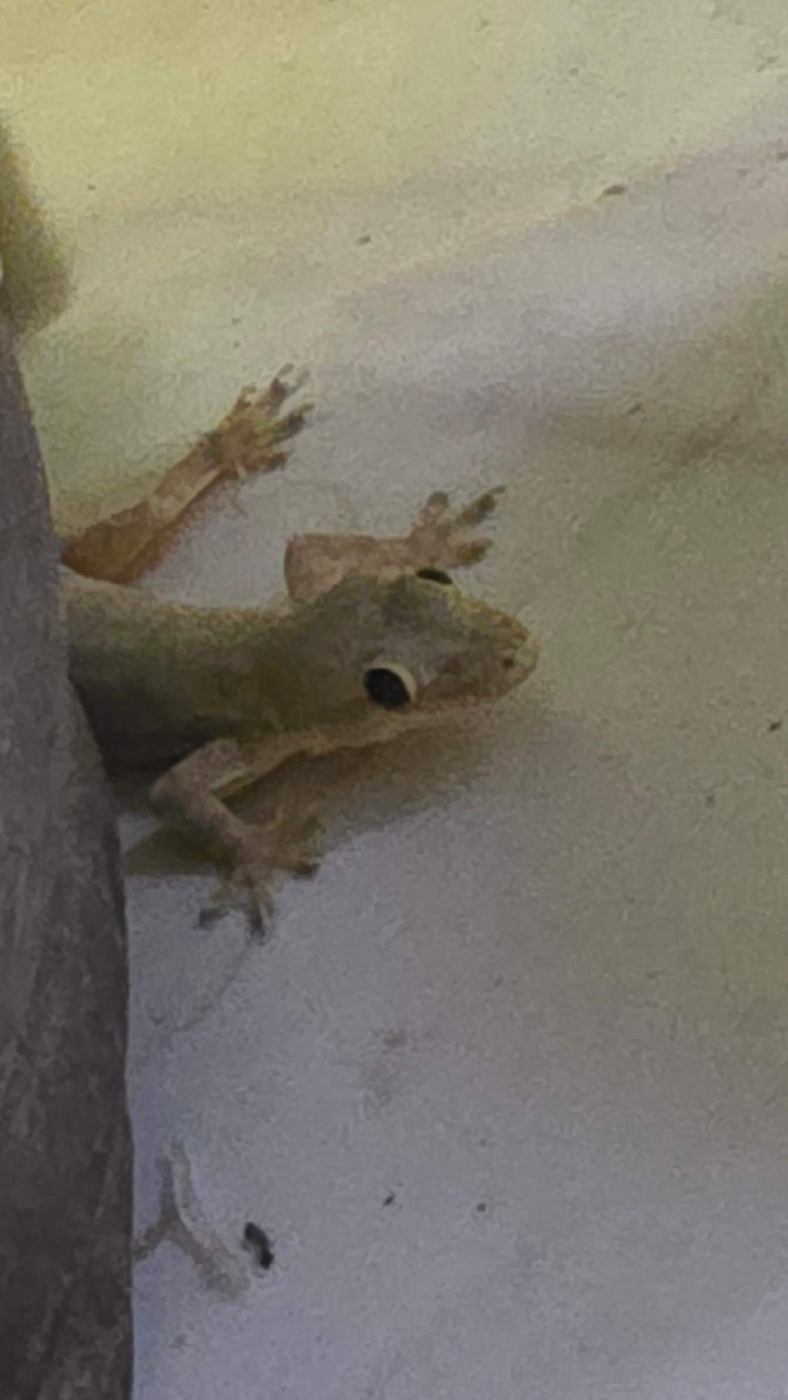 A light-colored gecko clings to a light-colored wall. The gecko is facing the viewer and its toes are spread. The location may be Bac Natural Heritage Area Trang, Vietnam.