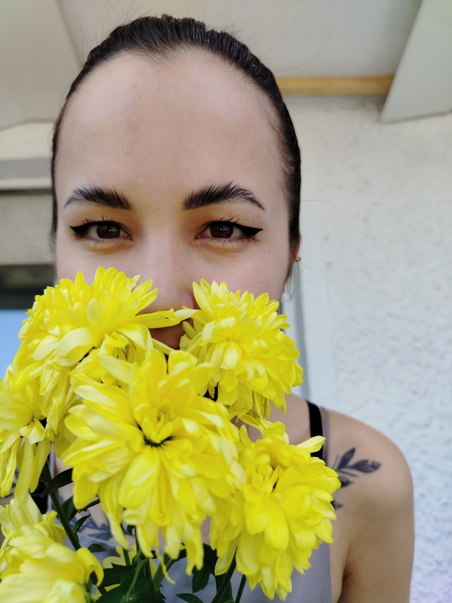 A woman is holding a bouquet of yellow chrysanthemums in front of her face, obscuring her nose and mouth. She is wearing black eyeliner and has her dark hair pulled back. A tattoo of a black leafy braβ¦read more