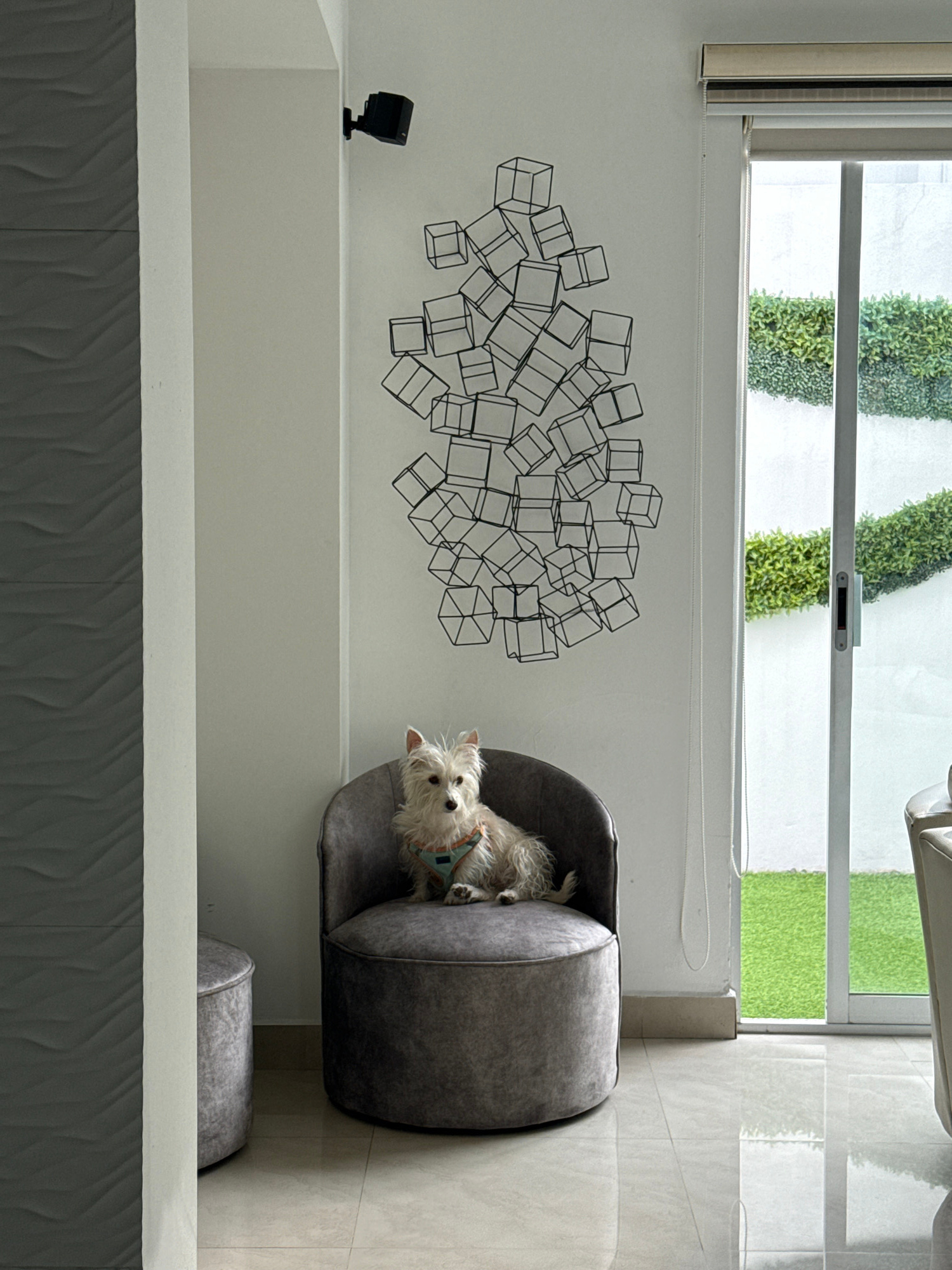 A high-angle indoor shot depicts a small, white dog in a gray chair. The chair is located near a wall decorated with a geometric pattern of black wireframe cubes. Above the wall, a window offers a vie…read more