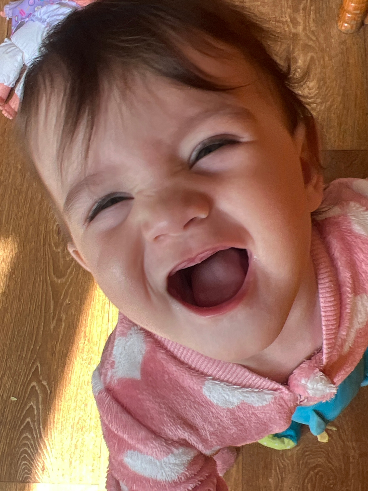 A baby with brown hair and fair skin is lying on their back on a wooden floor, wearing a pink and white patterned sweater. Their mouth is open, and their eyes are partially closed. A blue plush toy is…read more