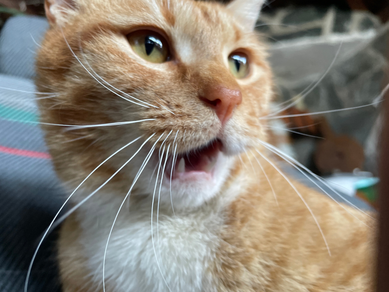 A close-up shot shows an orange and white cat with its mouth open, revealing its teeth. The cat has yellow eyes and long white whiskers. The background is blurred, showing a gray and red plaid object.…read more