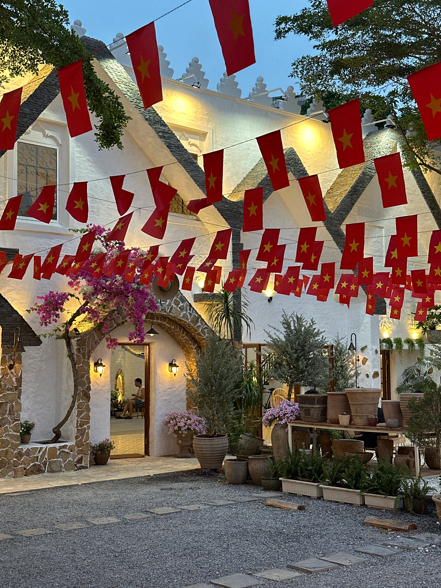 The image depicts a street scene in Thủ Đức, Vietnam, decorated with numerous Vietnamese flags strung across the street. The buildings are primarily white with stone accents and appear to be a restaur…read more