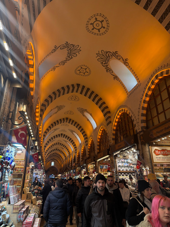 The image depicts the interior of a historical covered market hall, identified as the Spice Bazaar (Mısır Çarşısı) in Eminönü, Istanbul, Turkey. The scene is a long, vaulted corridor crowded with ind…read more