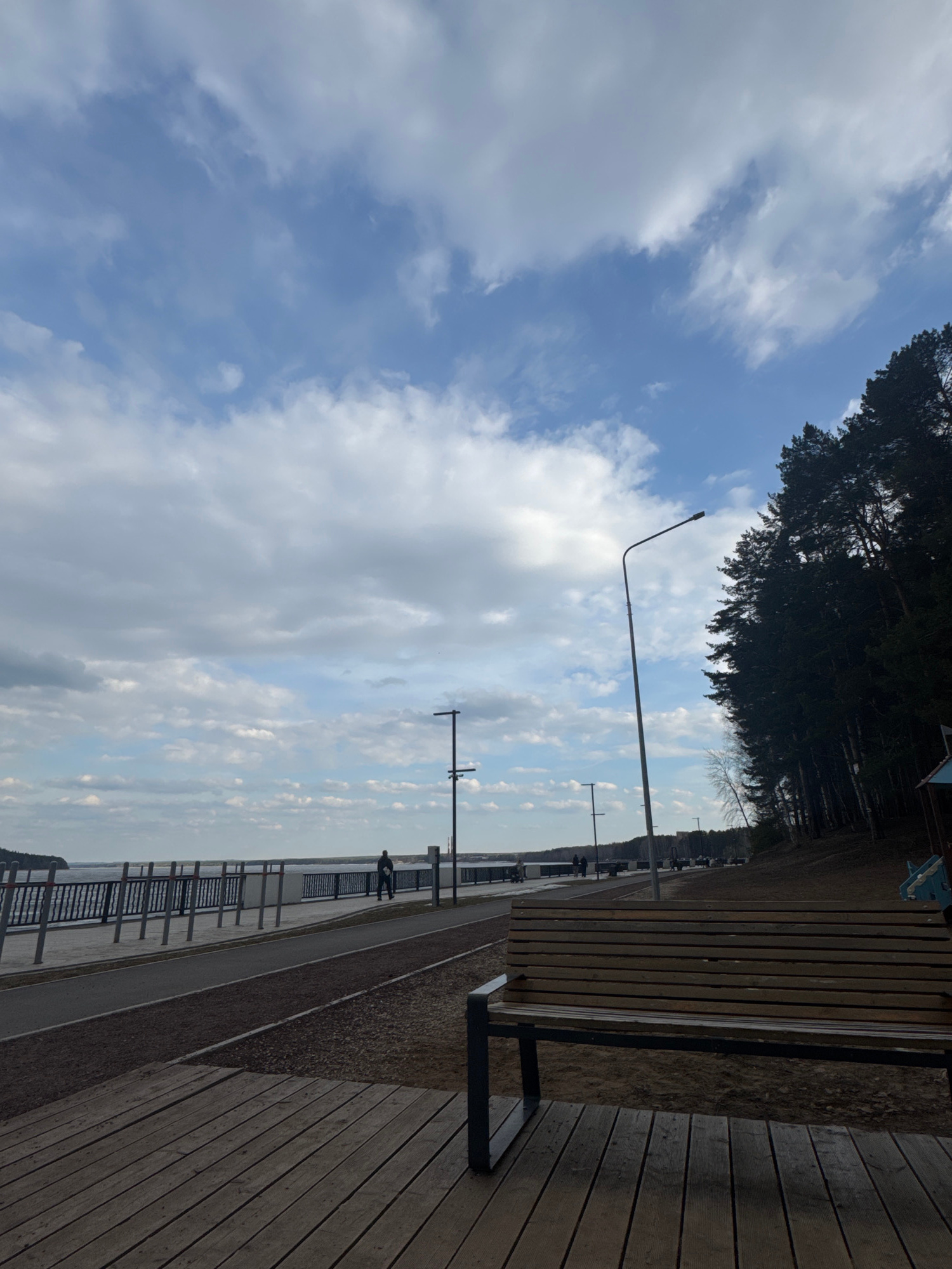The image captures a scenic waterfront promenade in Chaikovsky, Russia, on a partly cloudy day. The sky dominates the upper portion of the frame, filled with a mix of fluffy white and grey clouds agai…read more