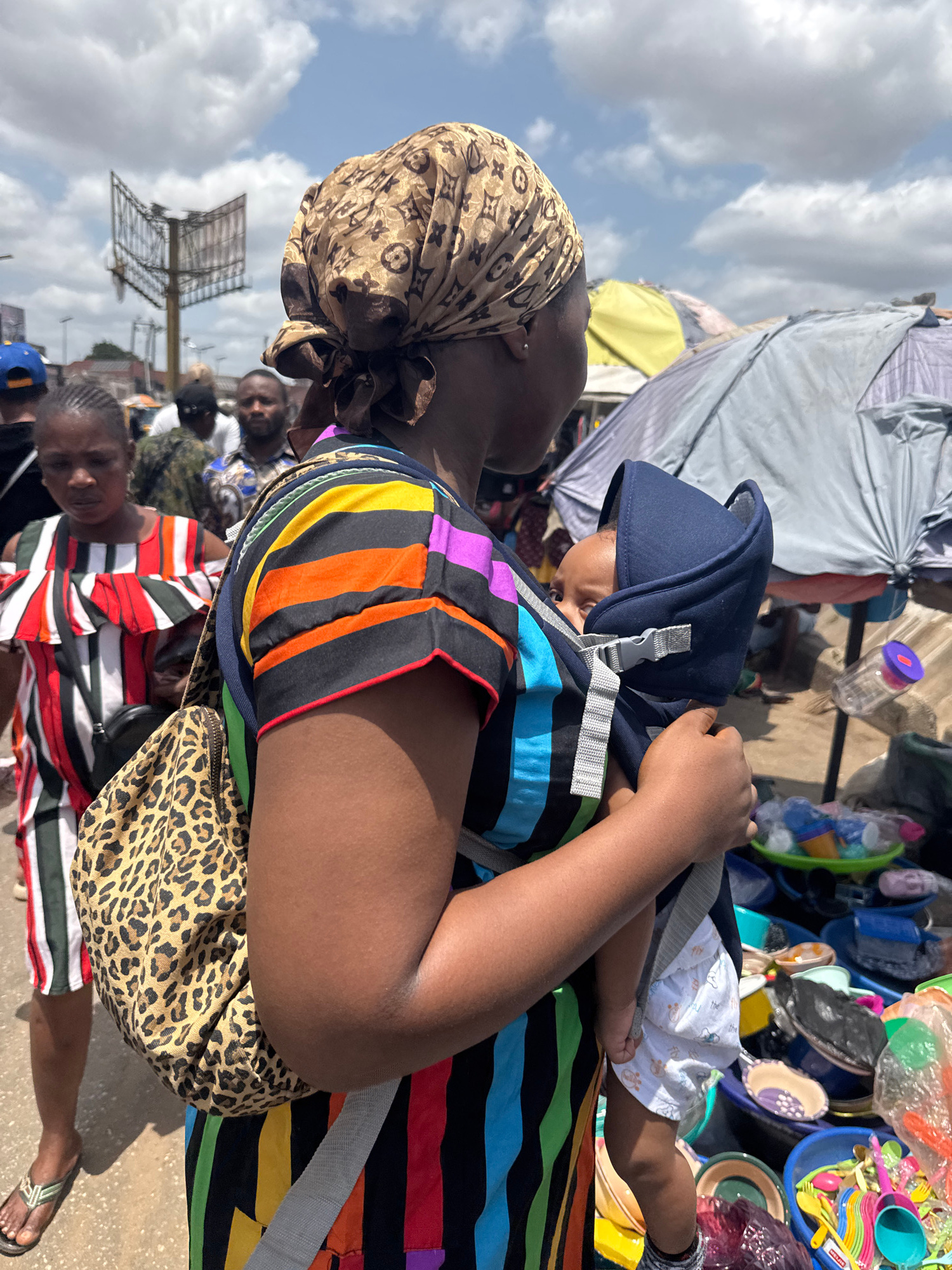 This vibrant, sunlit photograph captures a bustling outdoor market scene in Onitsha, Nigeria, under a partly cloudy blue sky. The main subject is a woman with dark skin, seen carrying a baby in a fron…read more