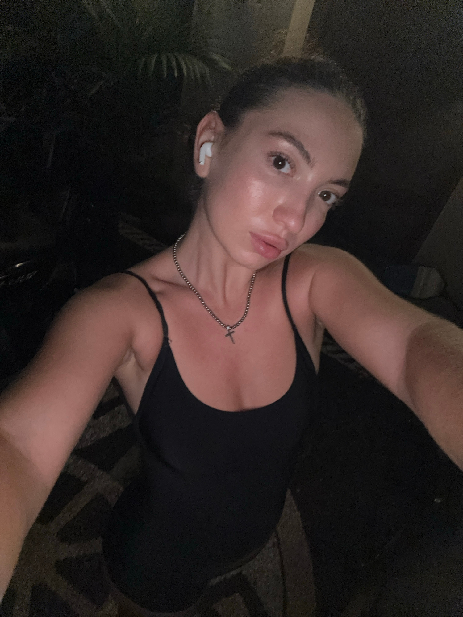 A fair-skinned woman poses for a selfie. She wears a black tank top and a thin chain necklace with a cross pendant. An earbud is visible in her left ear. The background is dark and indistinct, with hi…read more