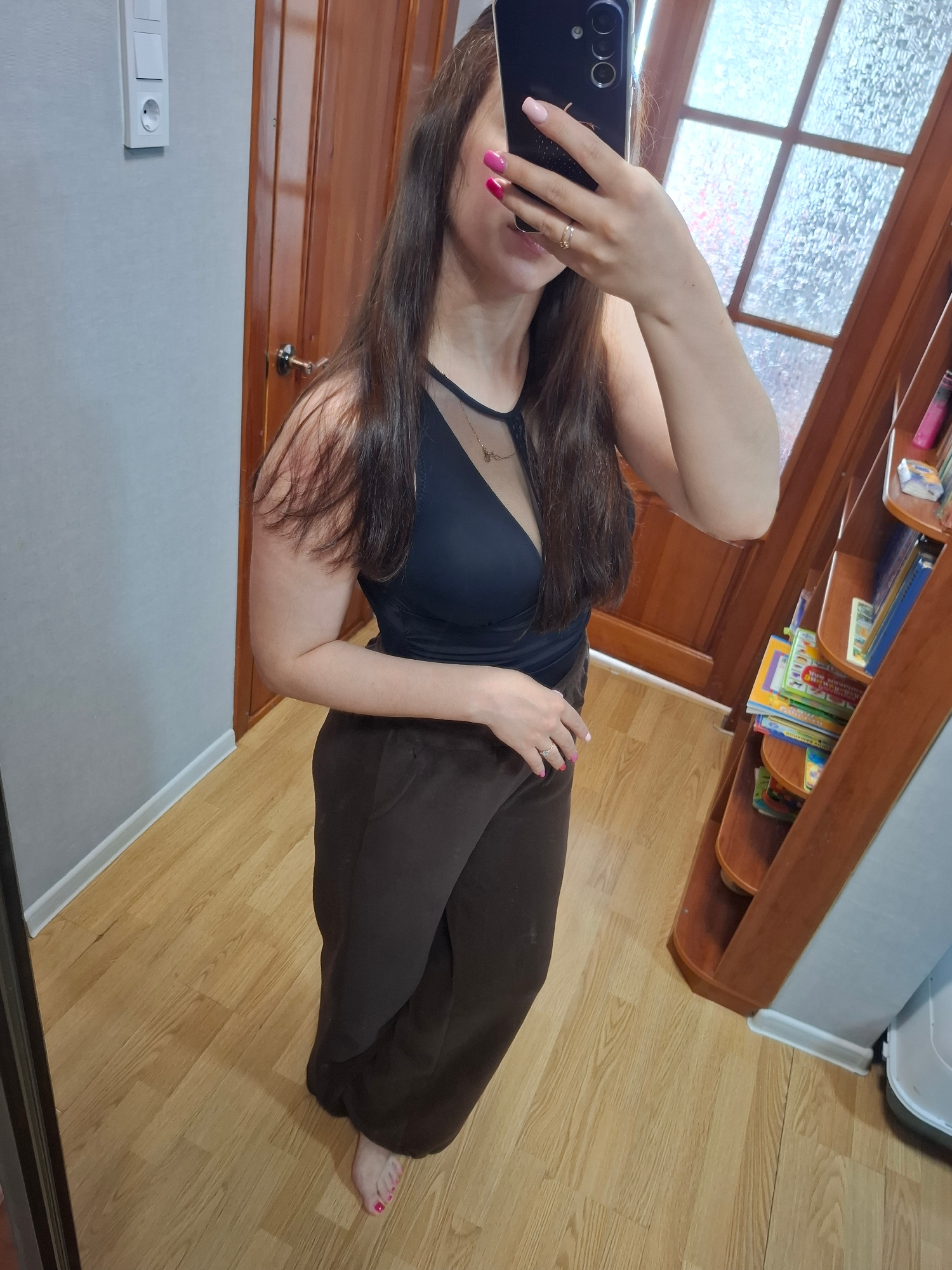 A person is taking a selfie indoors, likely in a residence. The individual is wearing a black tank top and dark brown sweatpants, and has painted their fingernails and toenails pink. The phone being uā¦read more