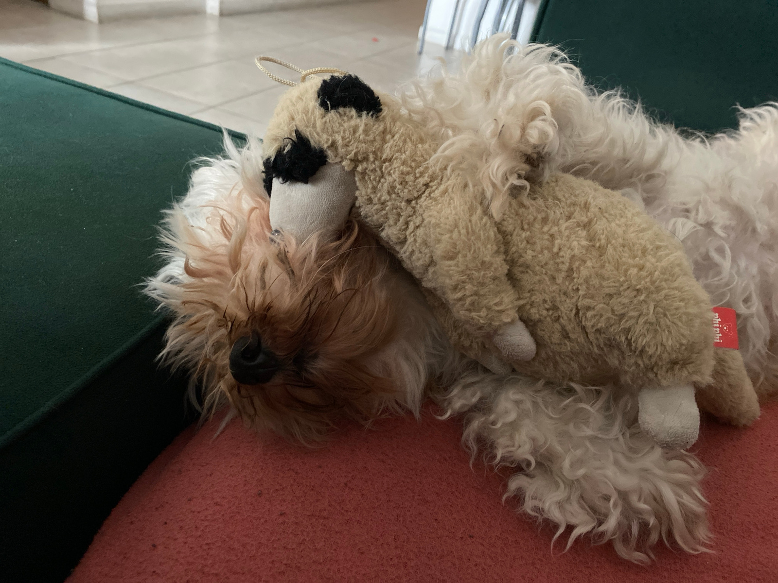 A tan and white long-haired dog is lying down on a pink surface, possibly a cushion or blanket. The dog has a stuffed sheep toy resting on its head. The setting appears to be indoors, near a green cou…read more