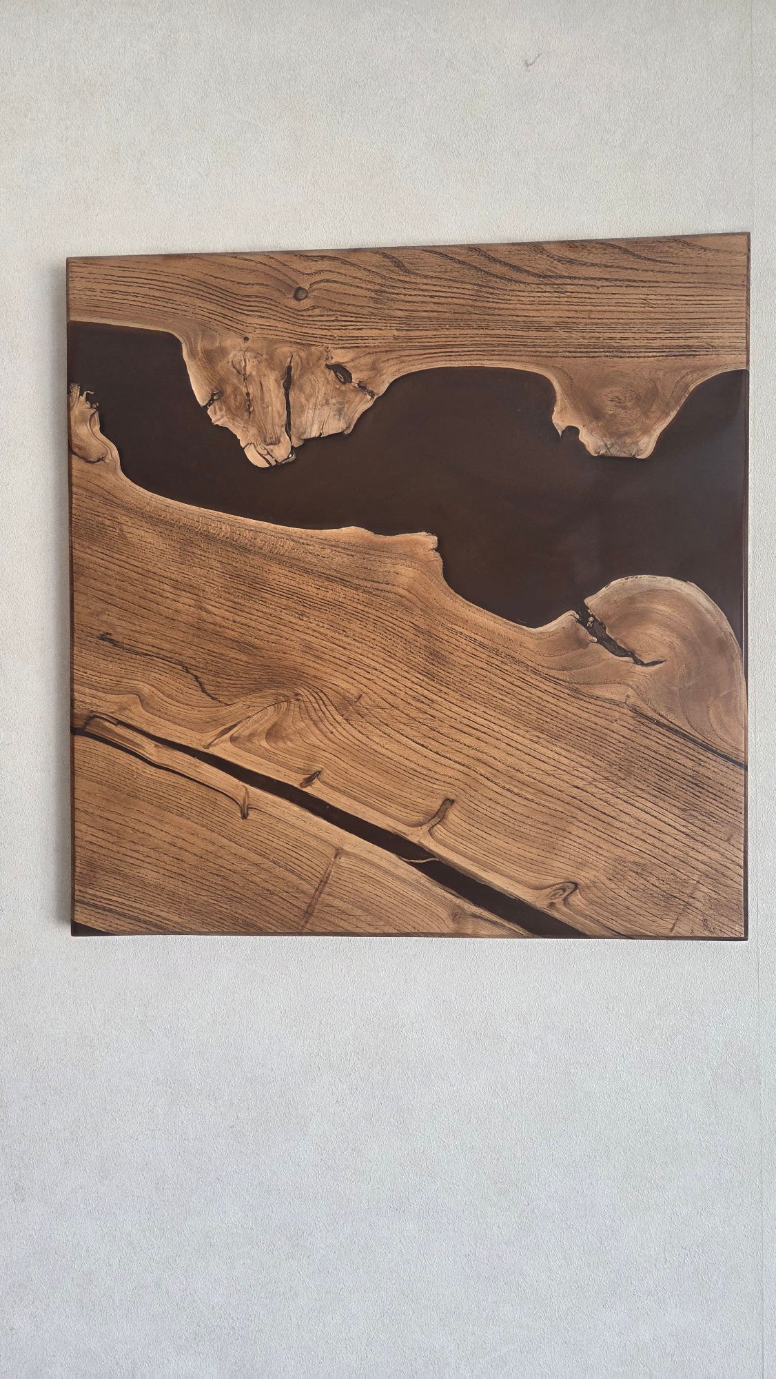 A square wooden slab featuring a large, irregular river of dark brown resin runs through its center. The wood grain is visible, and knots are incorporated into the piece. A dark, thin line of resin cu…read more