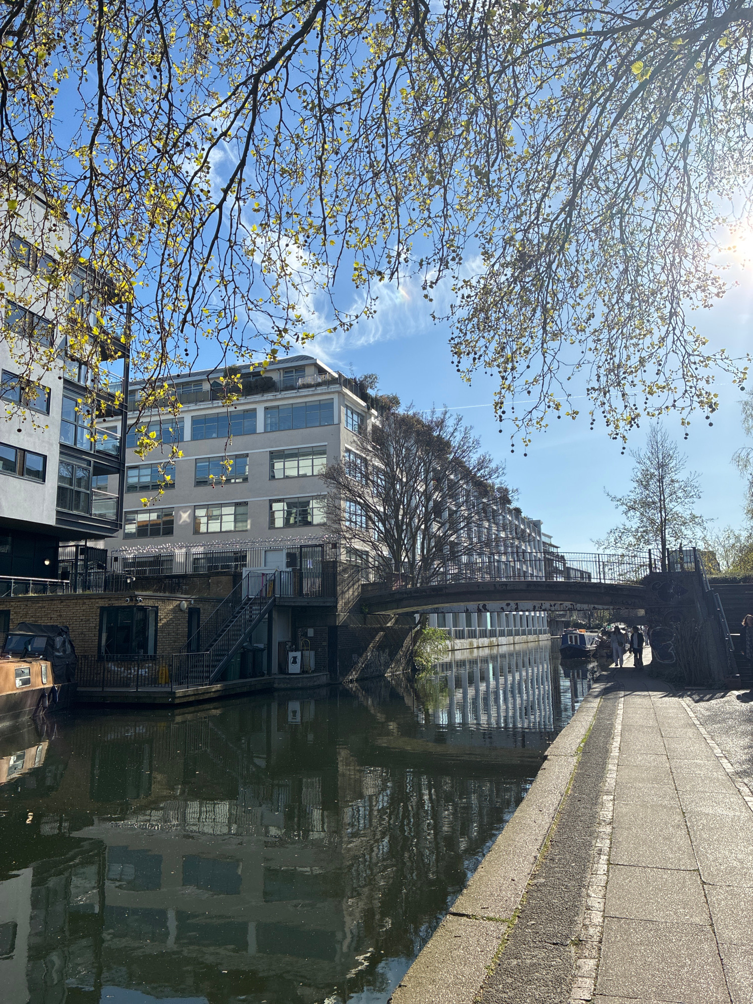 The image depicts a section of Regent's Canal in London, United Kingdom, viewed from a low angle. The canal's water reflects the surrounding architecture, primarily modern buildings with multiple stor…read more