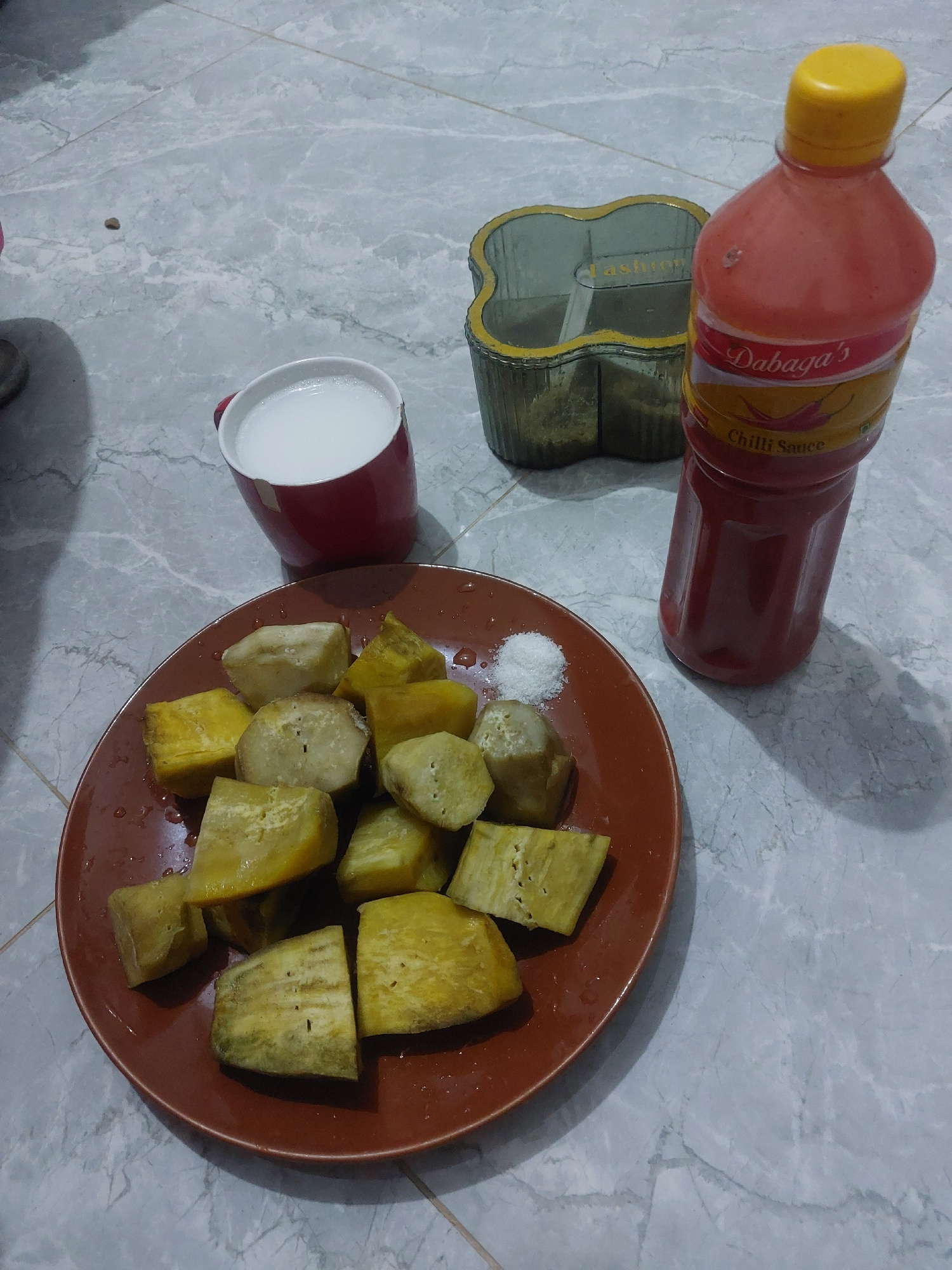 The image shows a plate of cooked cassava with a small pile of salt on it. To the left of the plate is a red cup filled with a white liquid. Above the plate are a container with a yellow trim and a bo…read more