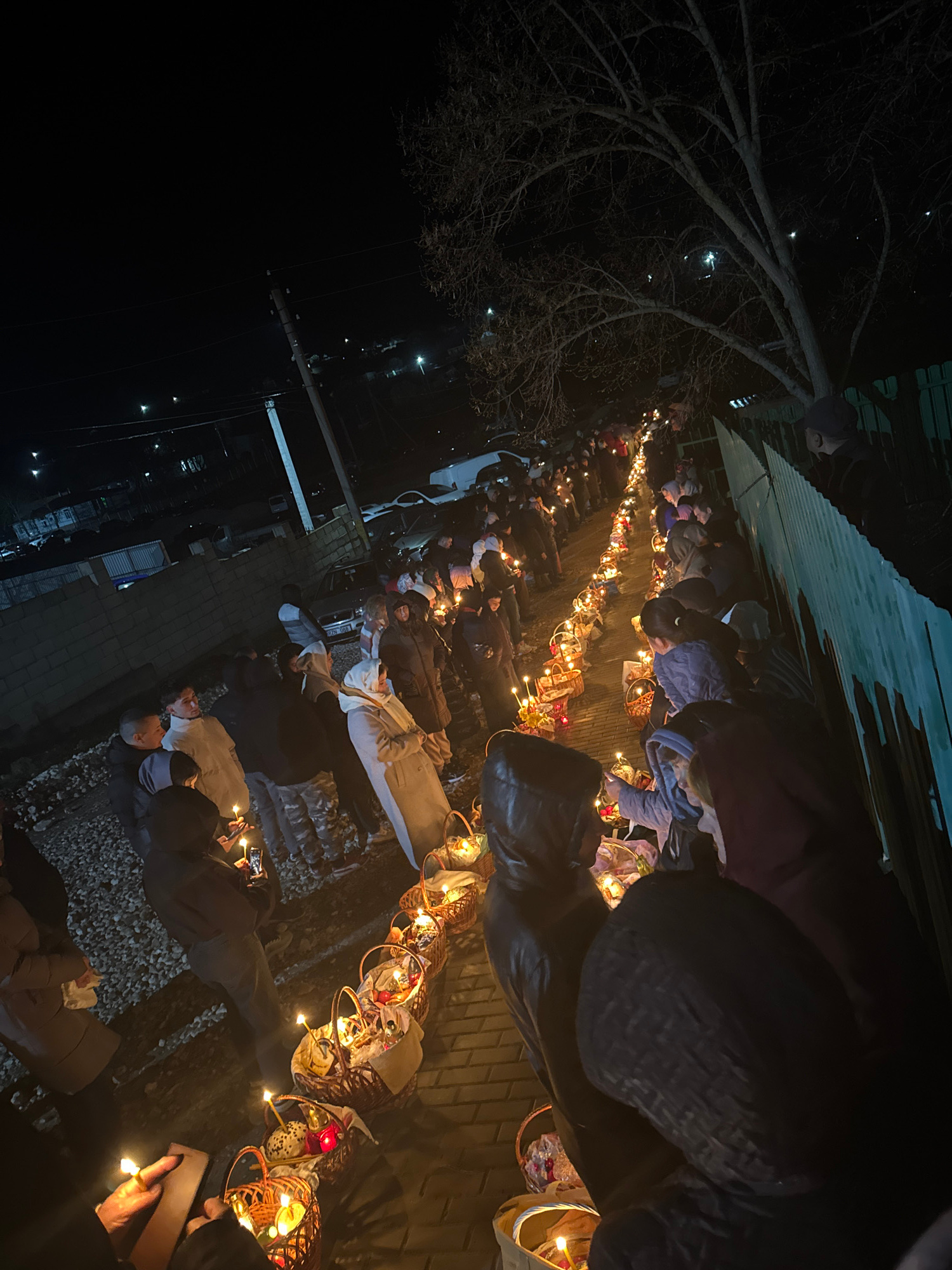 At night, a group of people stand in a line outside along a cobblestone walkway. Each person carries a lit basket decorated with lights and ornaments. Above them, bare tree branches are visible agains…read more