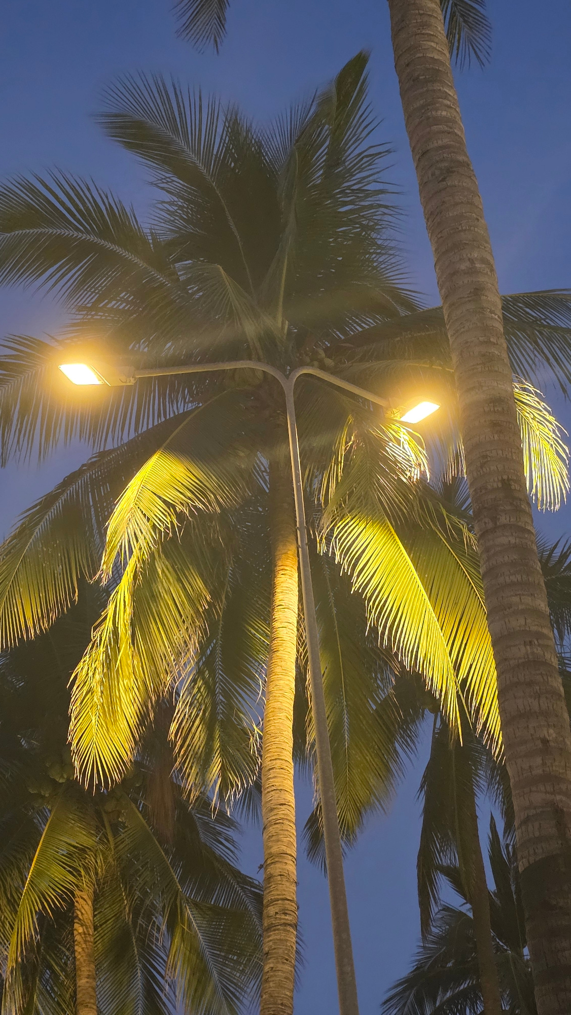 Looking upward, the low-angle shot captures a tropical nighttime scene in Nha Trang, Vietnam. The focus is on palm trees silhouetted against a dark blue sky. A tall, gray metal light post with two ill…read more