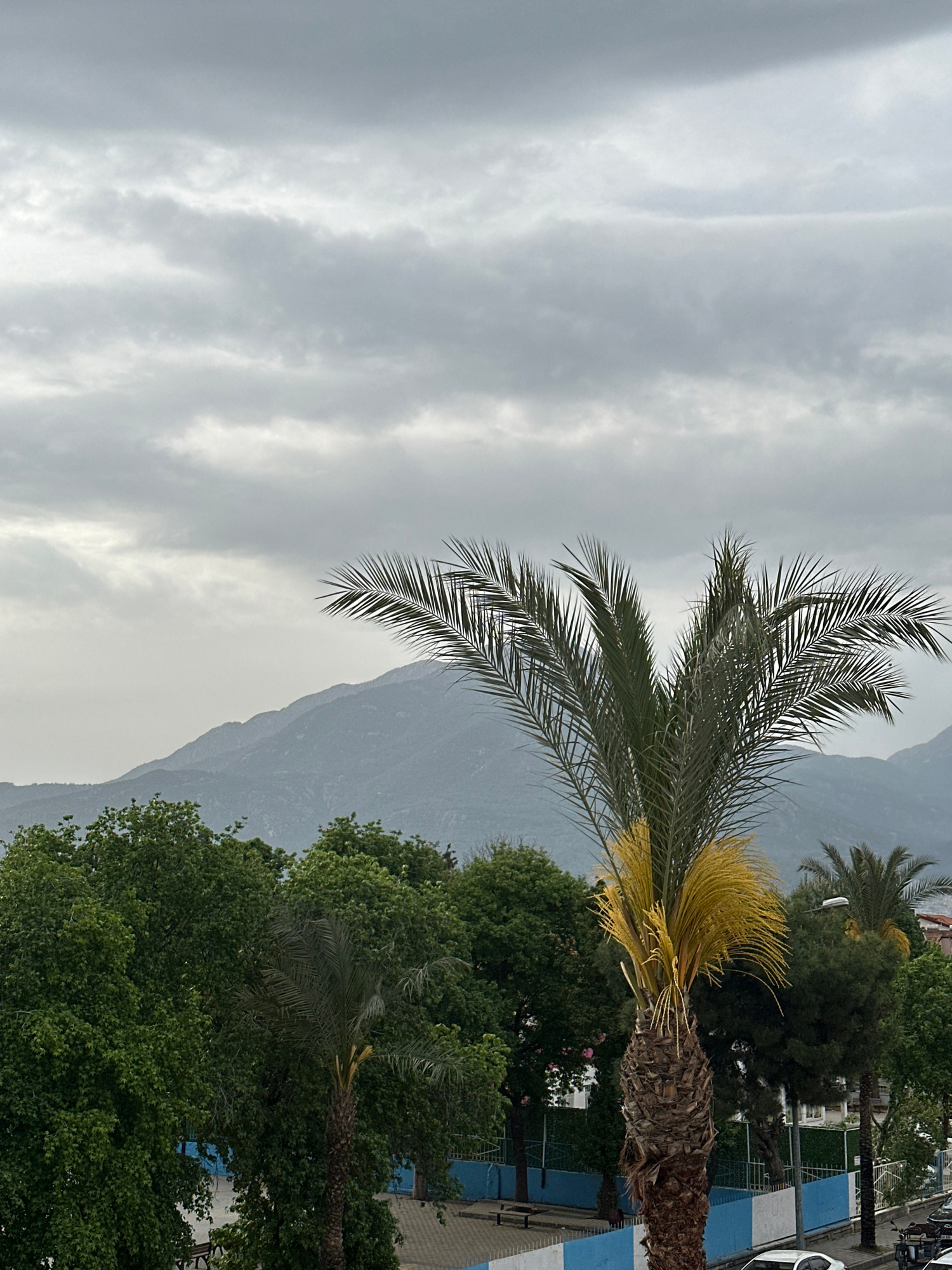 The image displays an outdoor scene on an overcast day, featuring natural and urban elements. A prominent palm tree with dark green fronds and golden-yellow seed clusters dominates the right side of t…read more