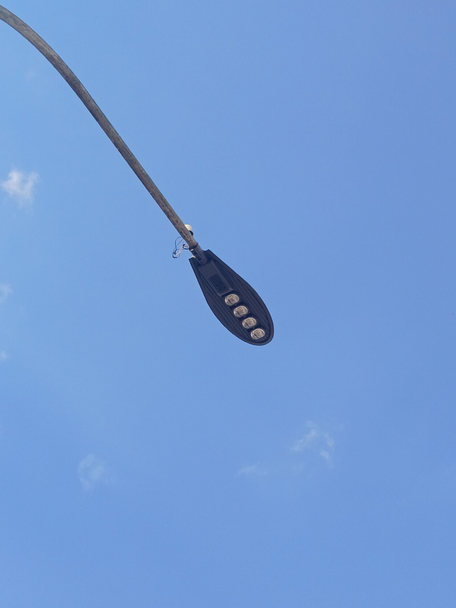 The image shows a streetlight in Guayana City, Venezuela against a clear blue sky with a few wisps of clouds. The streetlight is a dark color, possibly black or dark gray, and features five LED lights…read more