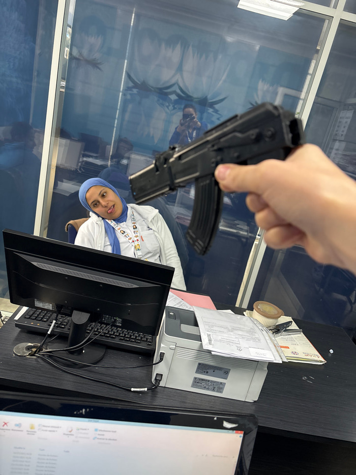 The image captures an indoor scene within a modern office environment, located in Meknes, Morocco. In the immediate foreground, a light-skinned hand holds a black replica assault rifle, resembling an…read more
