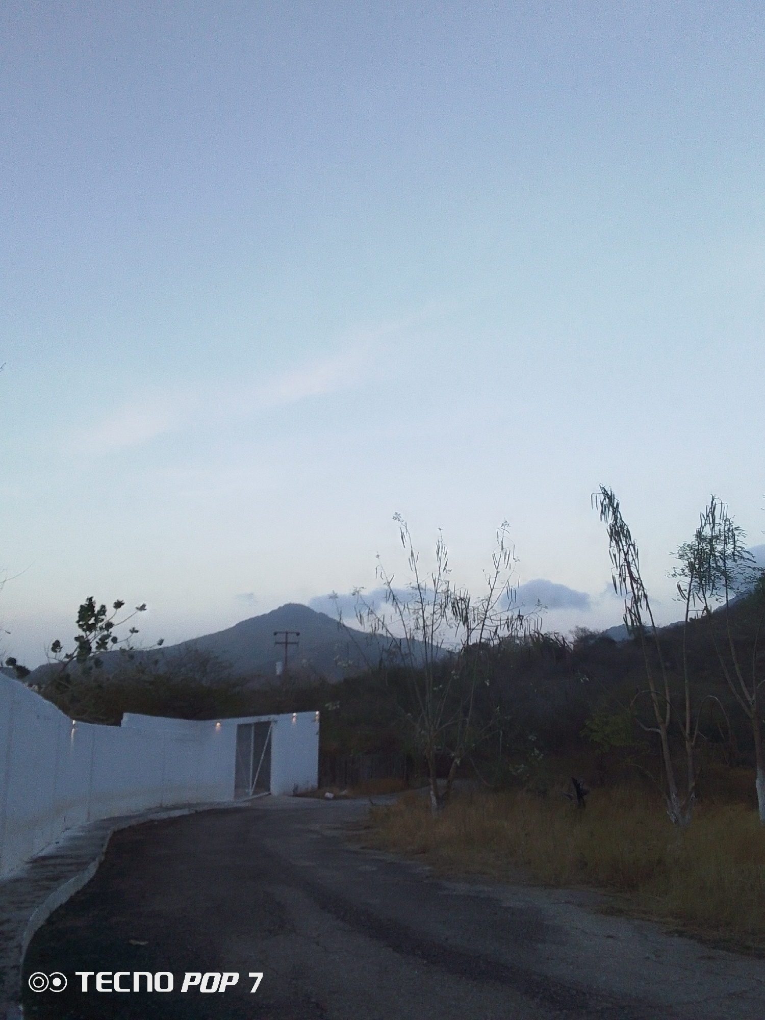 The image presents a dusky, rural scene likely captured in Altagracia, Venezuela, given the context provided. The foreground features a paved road curving past a low, white wall with an open doorway.…read more