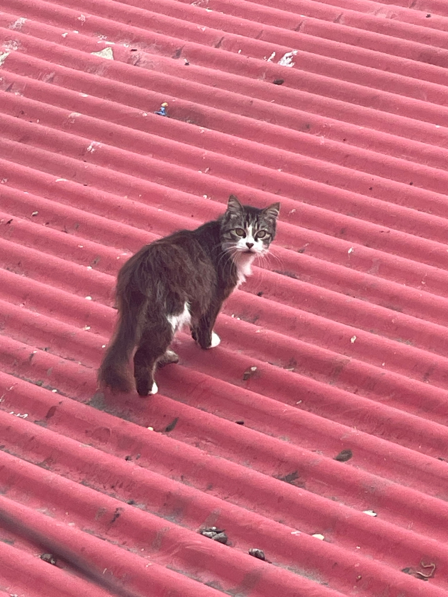 A medium-sized cat with gray and black fur and white patches is lying on a corrugated red metal surface, possibly a rooftop. The cat is looking upwards with its ears perked. The corrugated surface has…read more