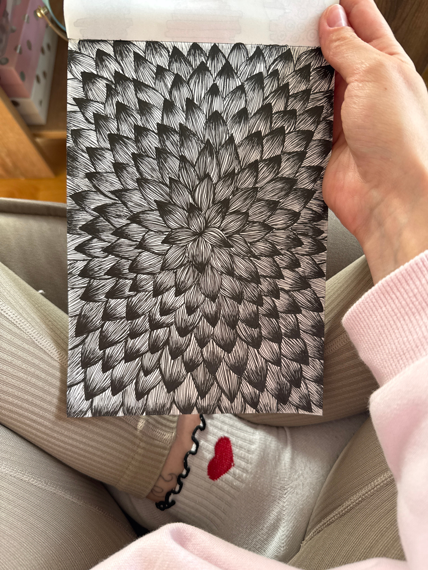 A person with manicured fingernails holds open a sketchbook displaying a detailed, hand-drawn mandala-like pattern in black ink on white paper. The drawing fills the frame and shows a radial arrangeme…read more