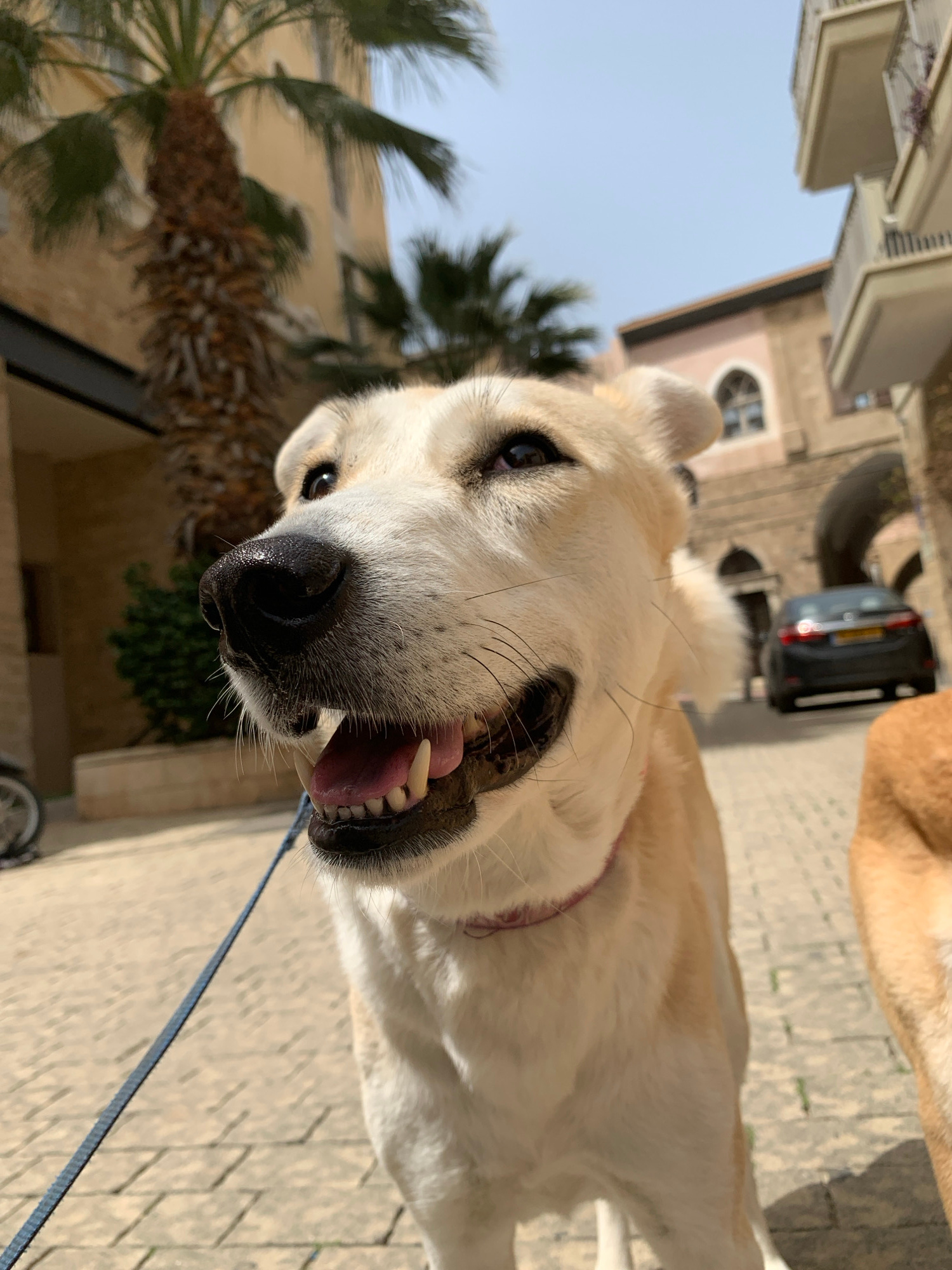 The image shows a close-up of a dog with primarily white fur and a tan/blonde coloration on its back, likely a mixed-breed dog. The dog's mouth is slightly open, revealing teeth and a pink tongue. The…read more