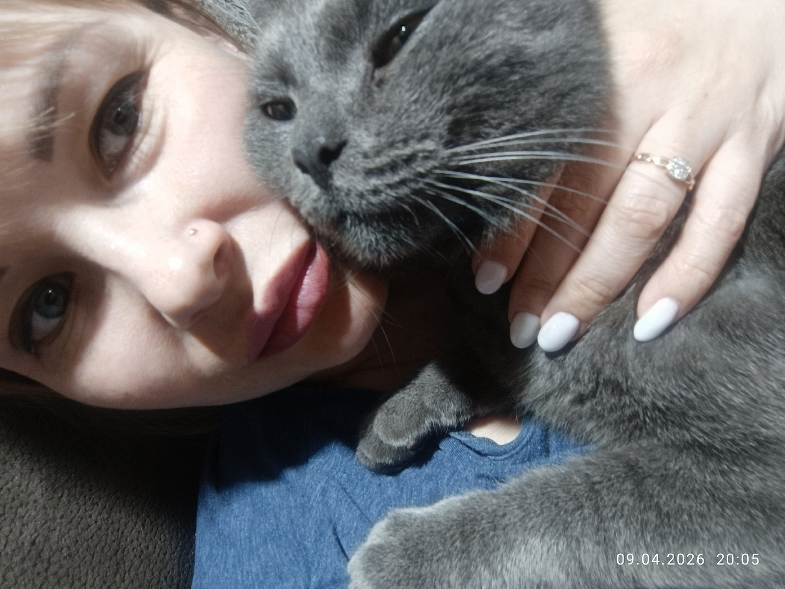 A woman with light-blonde hair and a nose piercing is cradling a gray cat in her arms. She is wearing a blue denim shirt. Her left hand is visible, and she has a ring on her ring finger. The date and…read more