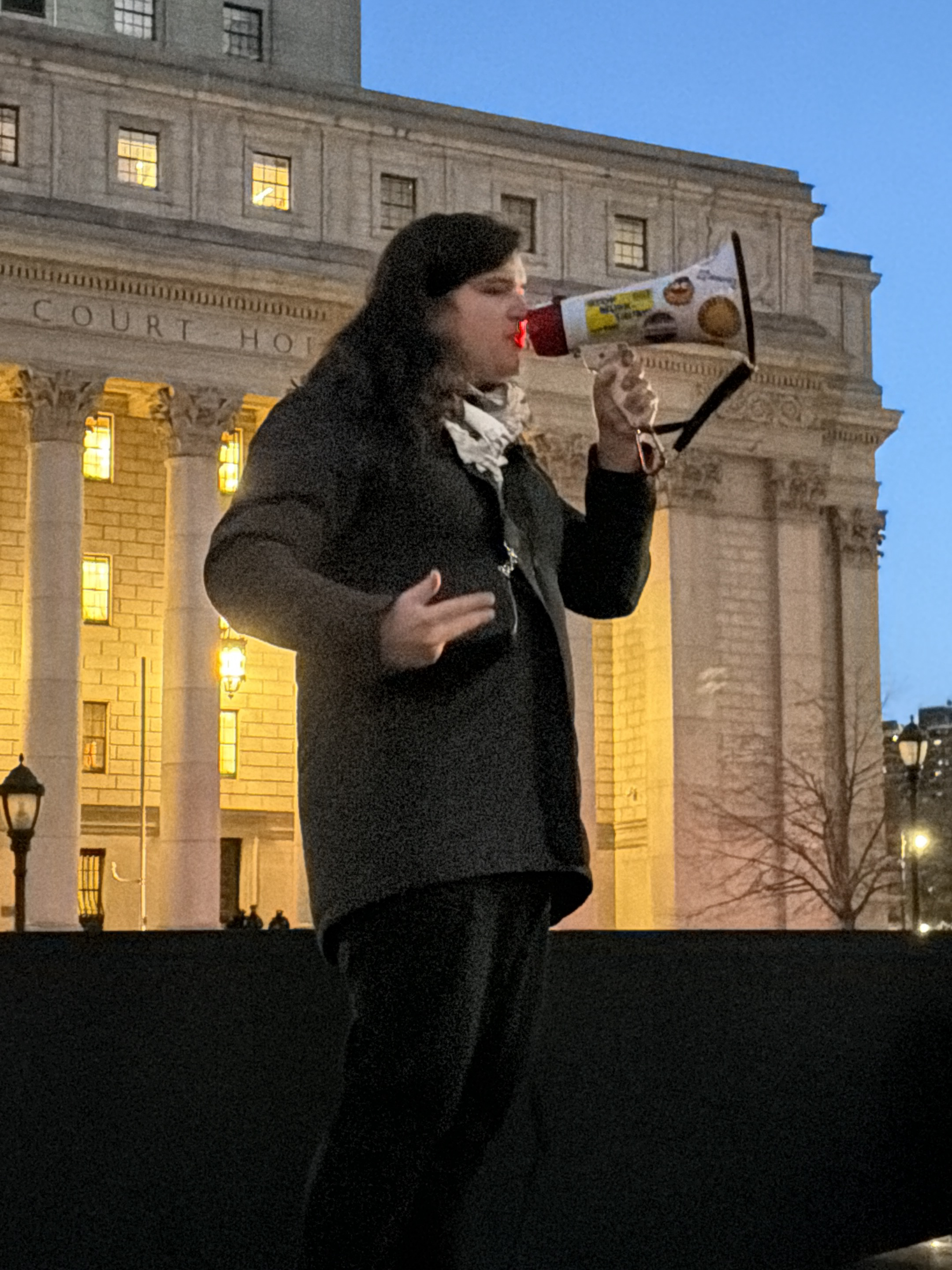 A person is standing outdoors, speaking into a megaphone, in front of the New York City Supreme Court Building, located at 60 Centre Street, New York, NY 10007. The person has long dark hair and wears…read more