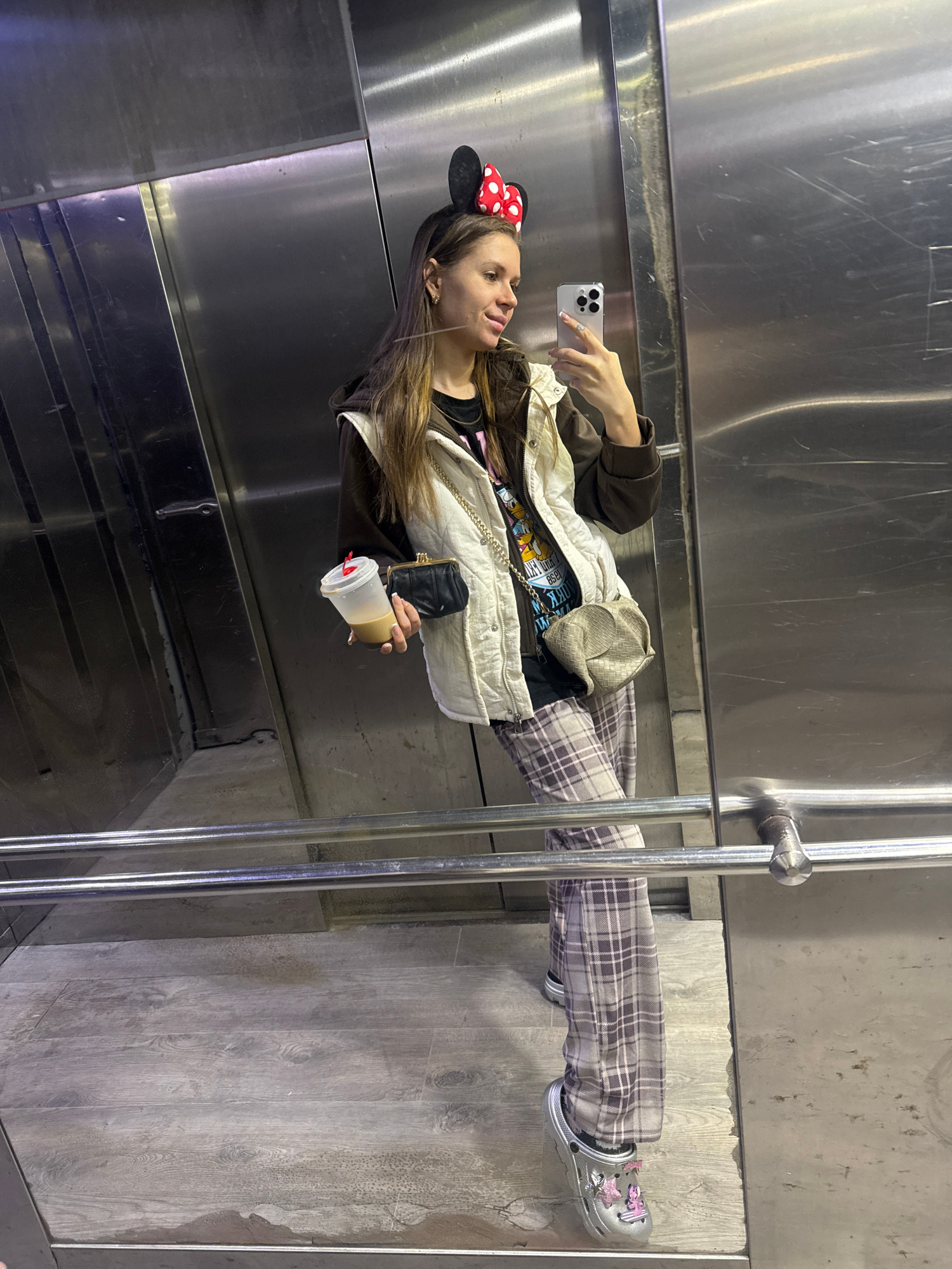 A young adult female is depicted standing within an elevator in Batumi, Georgia, taking a selfie. She is holding a silver-colored iPhone in her right hand, pointed towards a reflective metal wall. Theβ¦read more