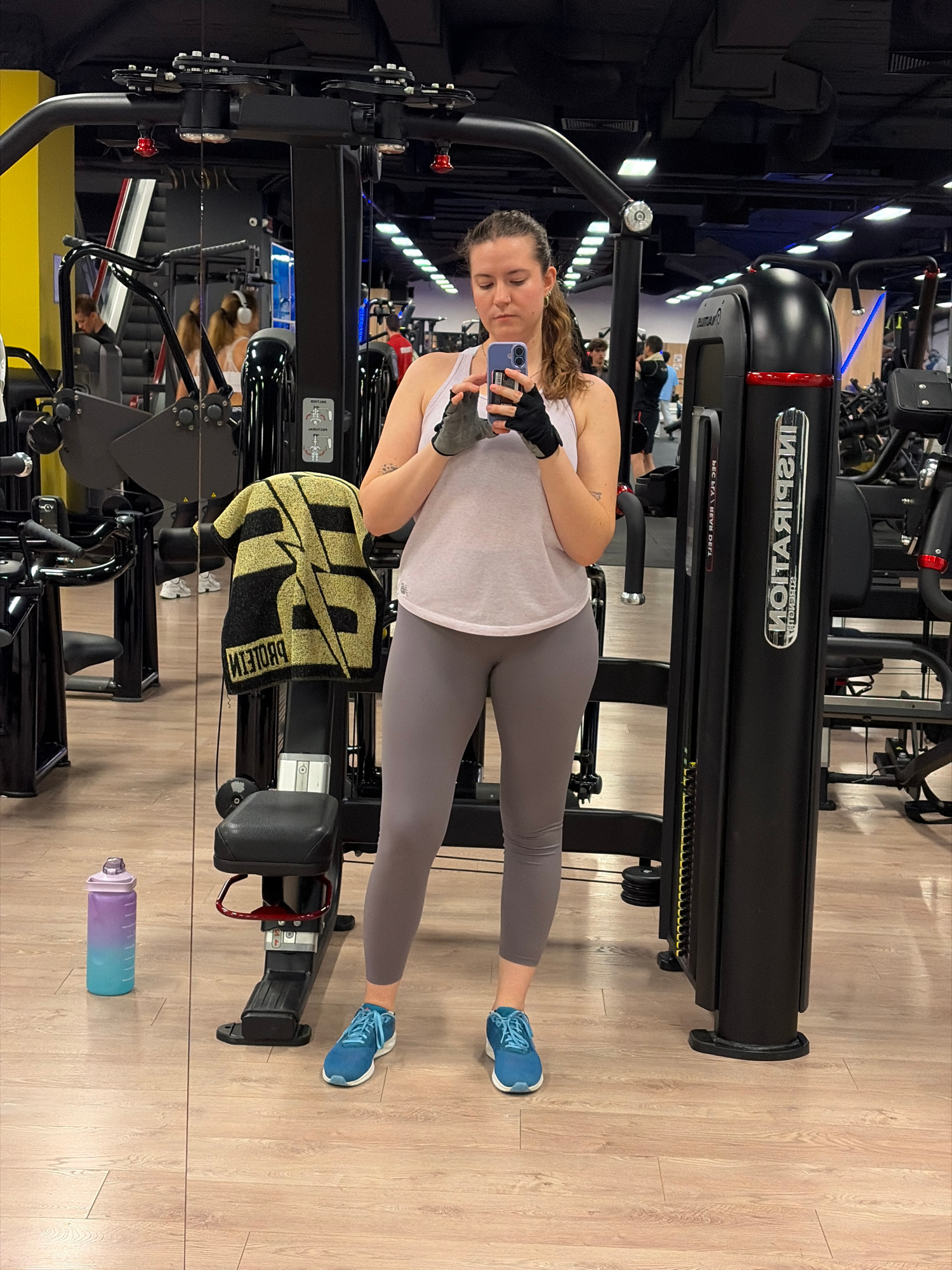 A woman is captured in a full-body mirror selfie within a modern gym setting. She stands upright, holding a smartphone in her left hand to take the picture, with her gaze directed towards the phone sc…read more