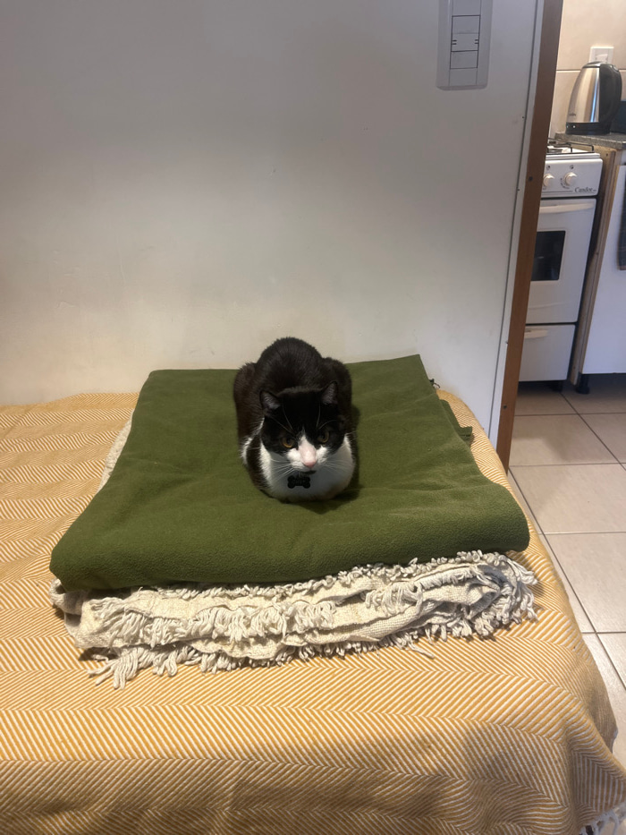The image displays an indoor domestic scene in Ushuaia, Argentina. A black and white domestic cat is centrally positioned, resting in a loaf configuration on a stack of three folded blankets. The topmβ¦read more