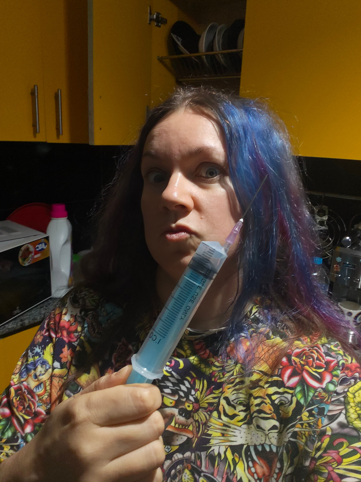 A person with blue and purple hair is holding a large syringe filled with blue liquid. The person is wearing a brightly colored shirt with a tiger print and floral designs. The background includes yel…read more