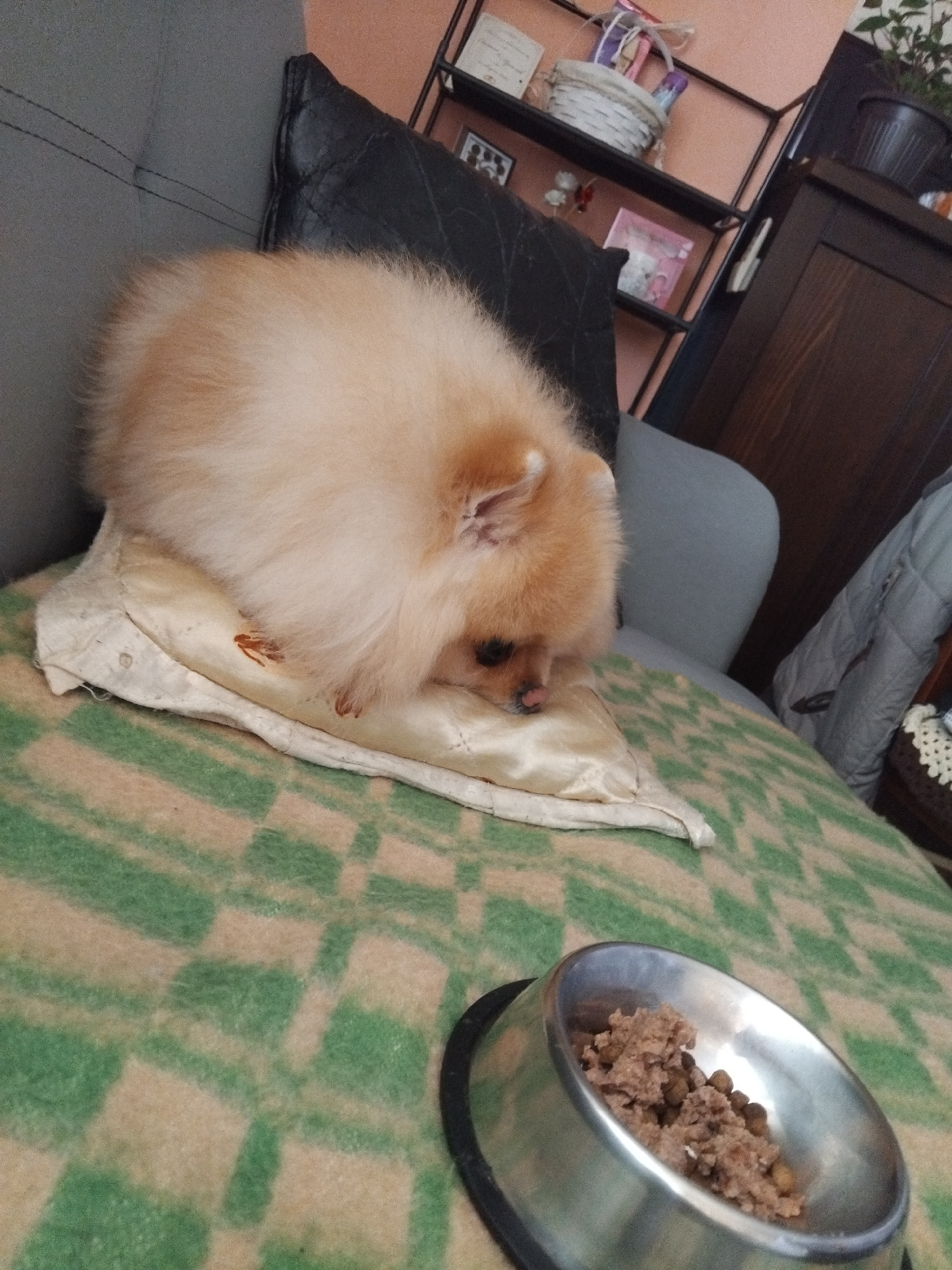 A close-up captures a light brown Pomeranian dog curled up and sleeping on a small, cream-colored pillow. The pillow is positioned on a couch, next to a black leather pillow. Beside the dog, resting o…read more