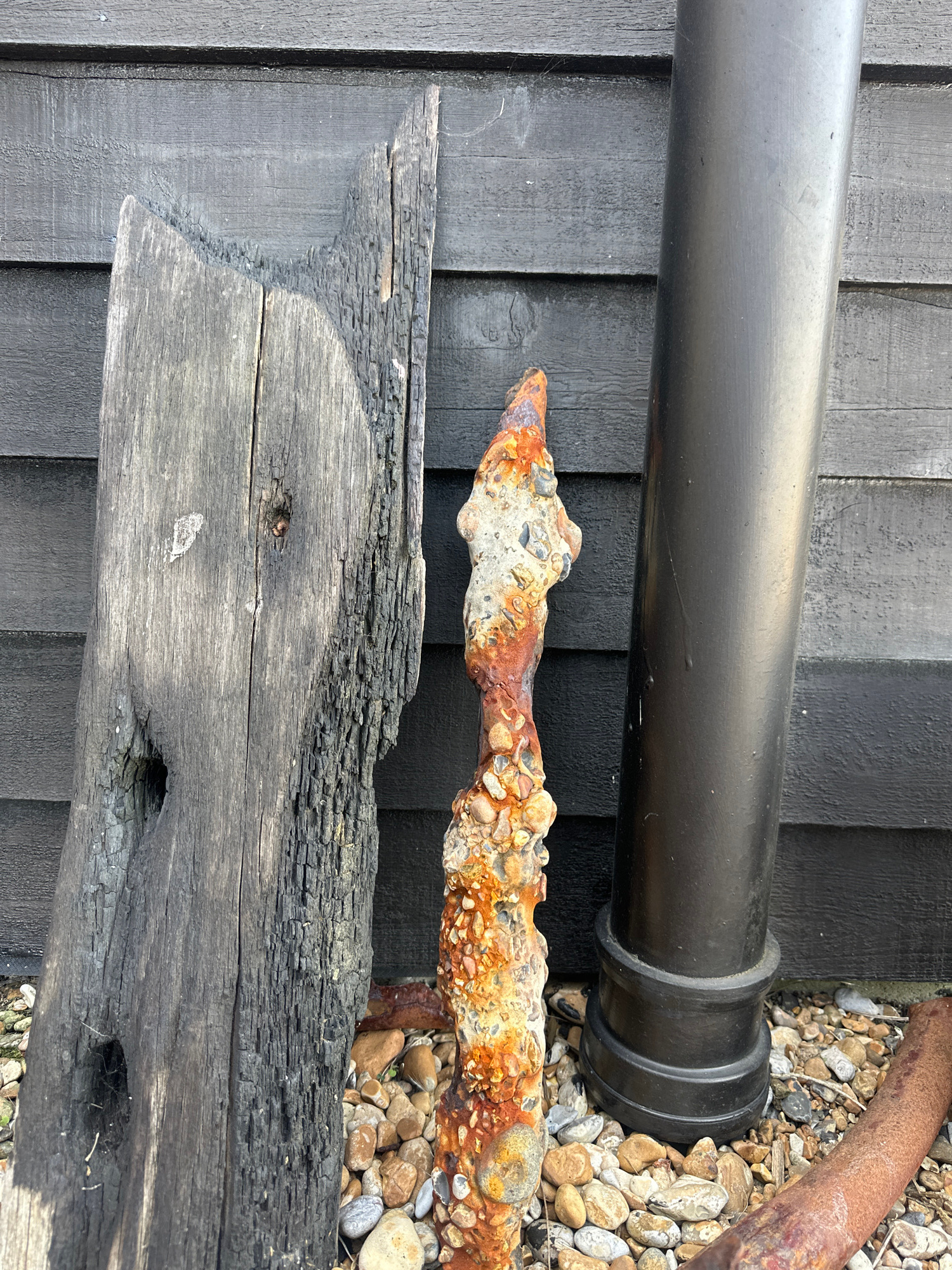 The image shows a close-up view of various objects. A black pipe runs horizontally across the top of the frame, positioned against a dark wooden wall constructed of vertical planks. Below the pipe is…read more