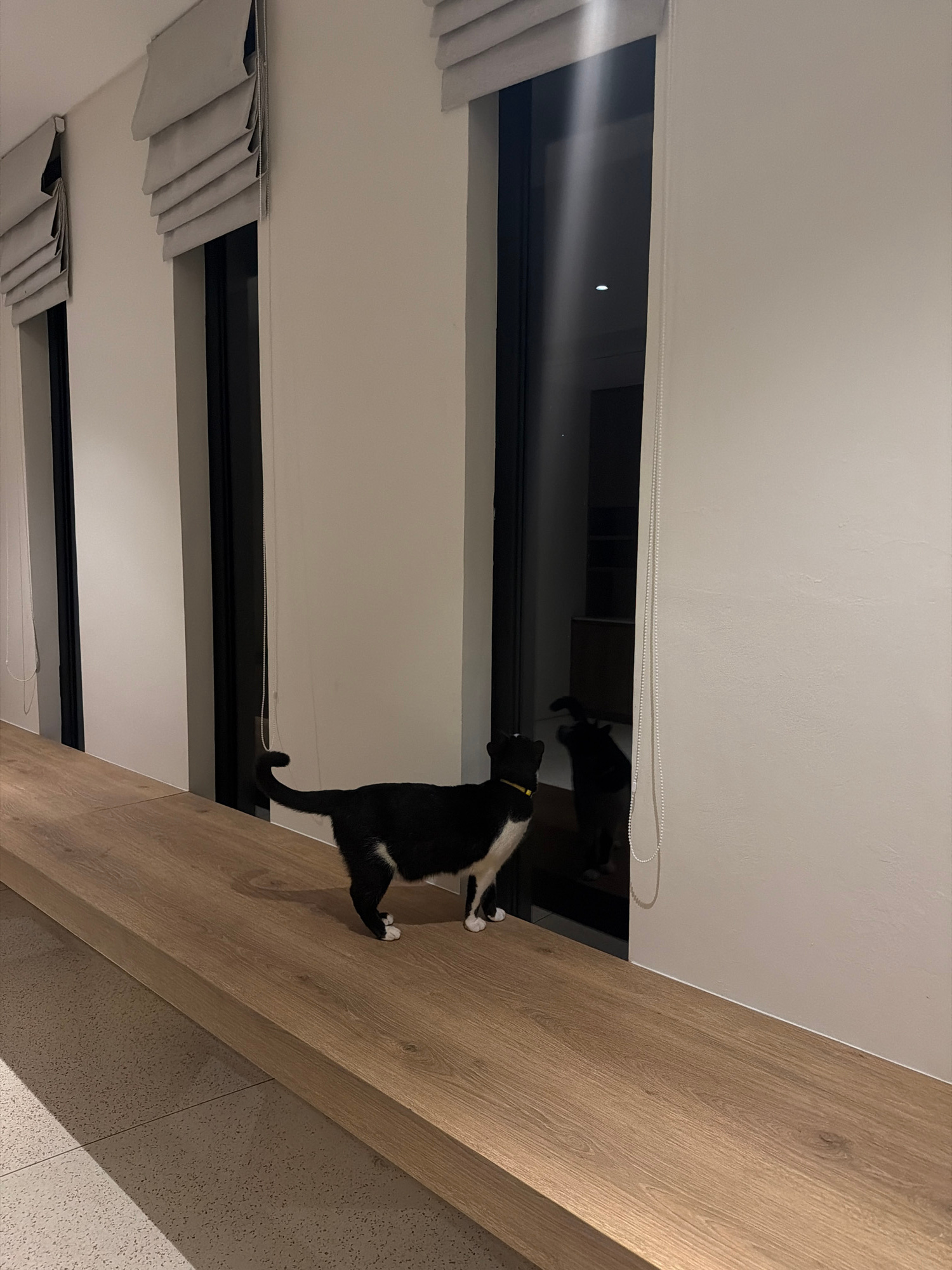 A black and white cat with a yellow collar stands on a horizontal wooden beam. The beam appears to be part of the interior structure of a building. In the background, window blinds are visible, sugges…read more