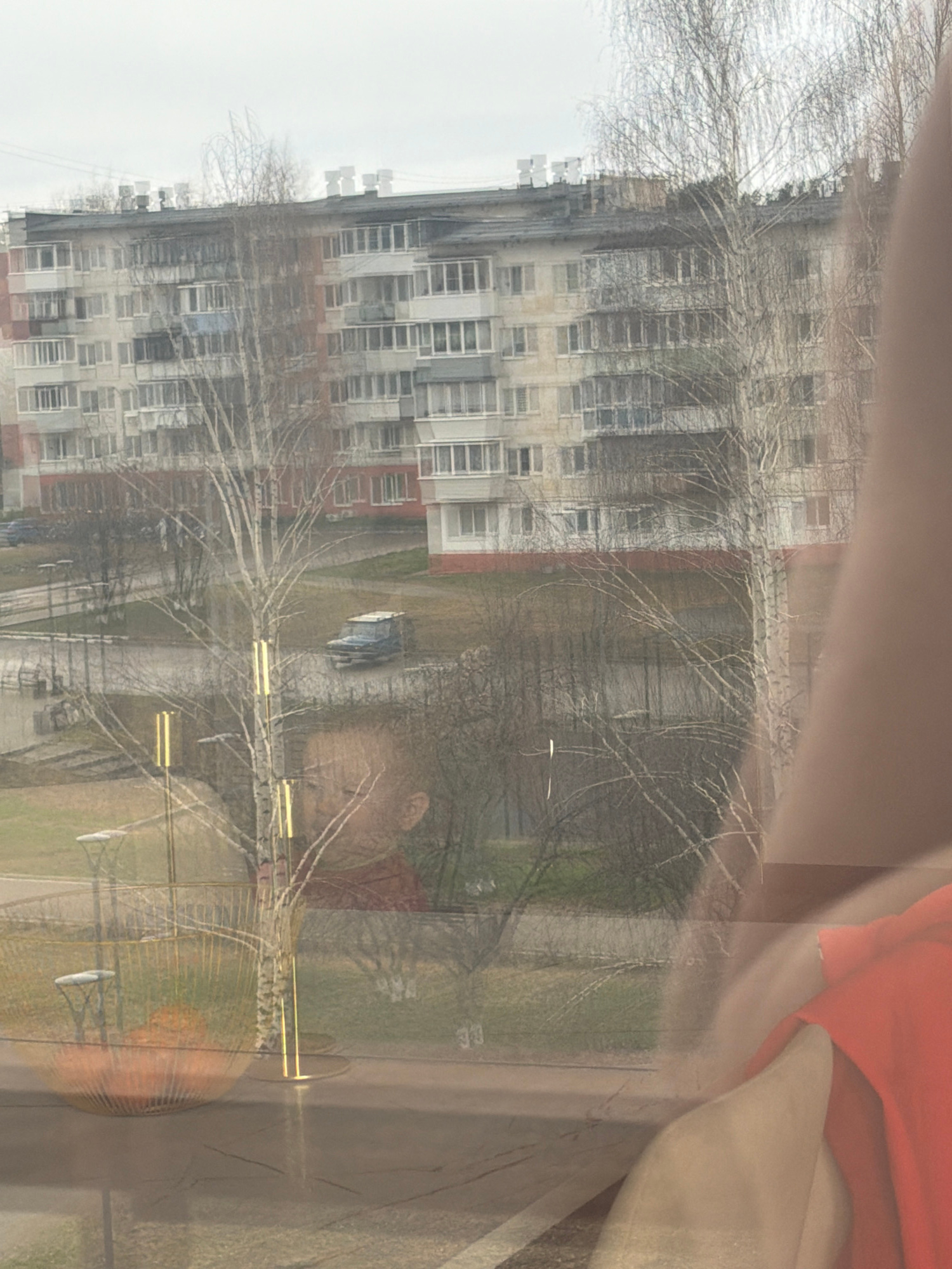 The image shows a view from inside a building, likely through a window. Outside, there is an apartment building, trees without leaves, a park area, a road and a parked vehicle. The location is likely…read more