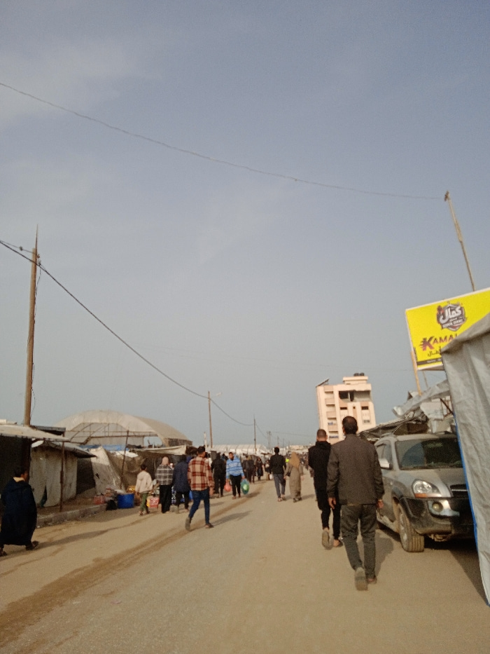 The image depicts a crowded, unpaved street or thoroughfare in Khan Yunis, Palestinian Territory, under a clear, light blue sky. In the foreground on the left, a person in dark clothing is crouched be…read more