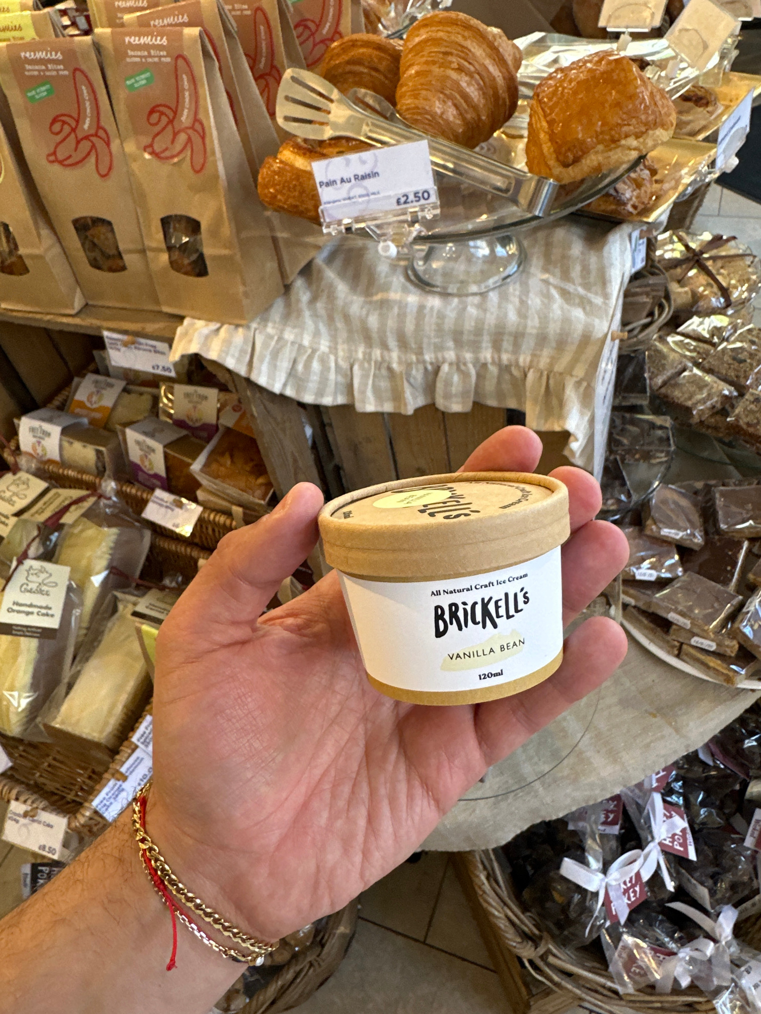 A hand holds a small container of Brickell's Vanilla Bean ice cream (120ml) against a backdrop of various pastries and packaged goods in a store setting. The pastries include croissants, pain au raisi…read more