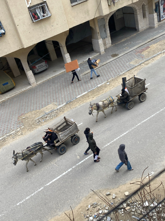 An elevated view captures a street scene in Khan Yunis, Palestinian Territory. The scene features a paved asphalt road marked by two parallel white lines, bordered on the left by a patterned concrete…read more