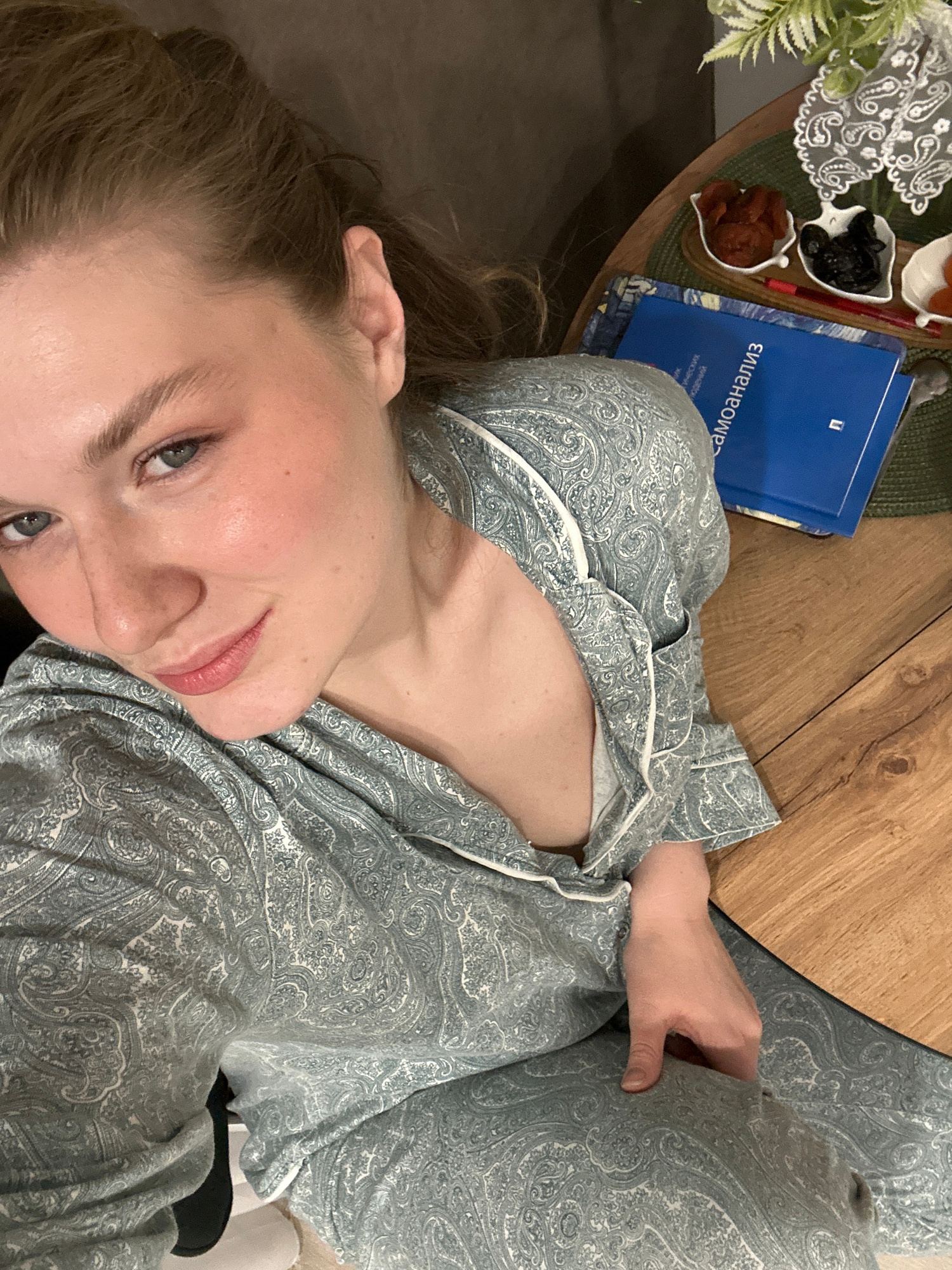 A selfie taken indoors shows a woman in a paisley-patterned pajama set. She is close to a round wooden table. On the table is a small tray with what appears to be dried fruit and a blue book with text…read more