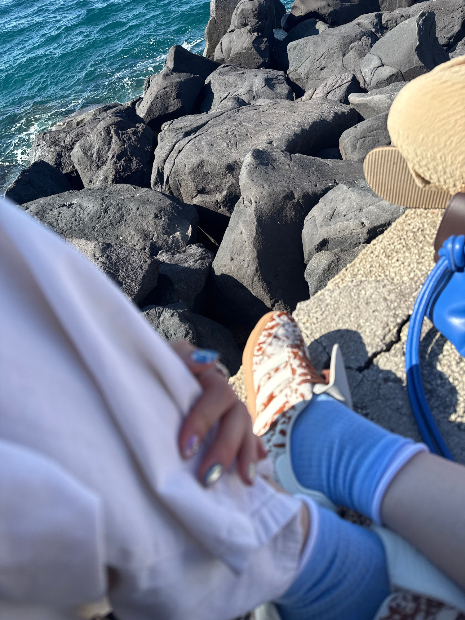 The image shows a person on a rocky cliff in Sorrento, Italy, overlooking the sea. The person is wearing blue socks and brown and white tie-dye style slip-on shoes. They are also wearing a white outfi…read more