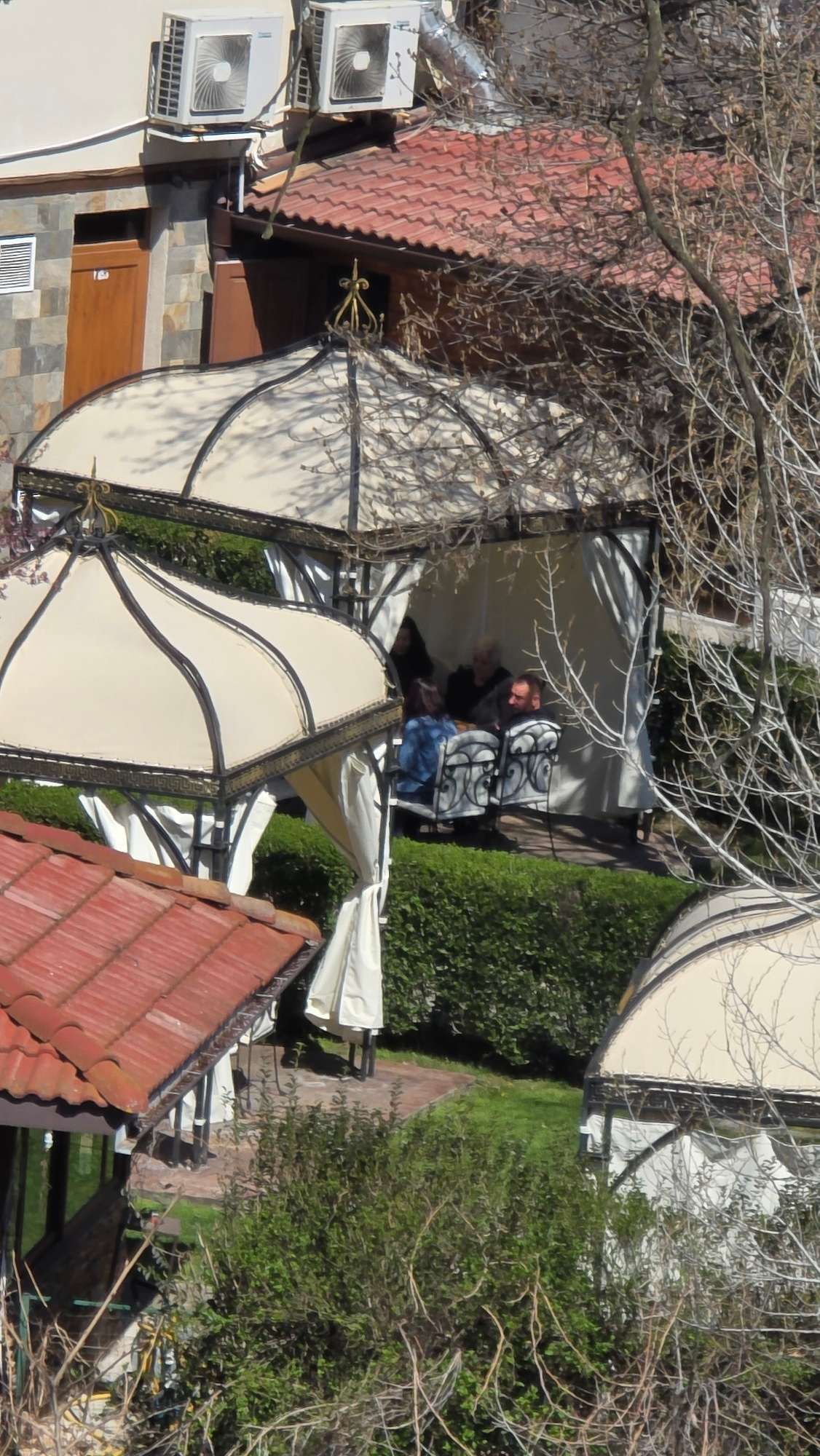 The image shows an outdoor dining area in Marulevo, Bulgaria. Several tables with curved white awnings are present. Two people are seated at one of the tables under an awning. The surrounding environm…read more