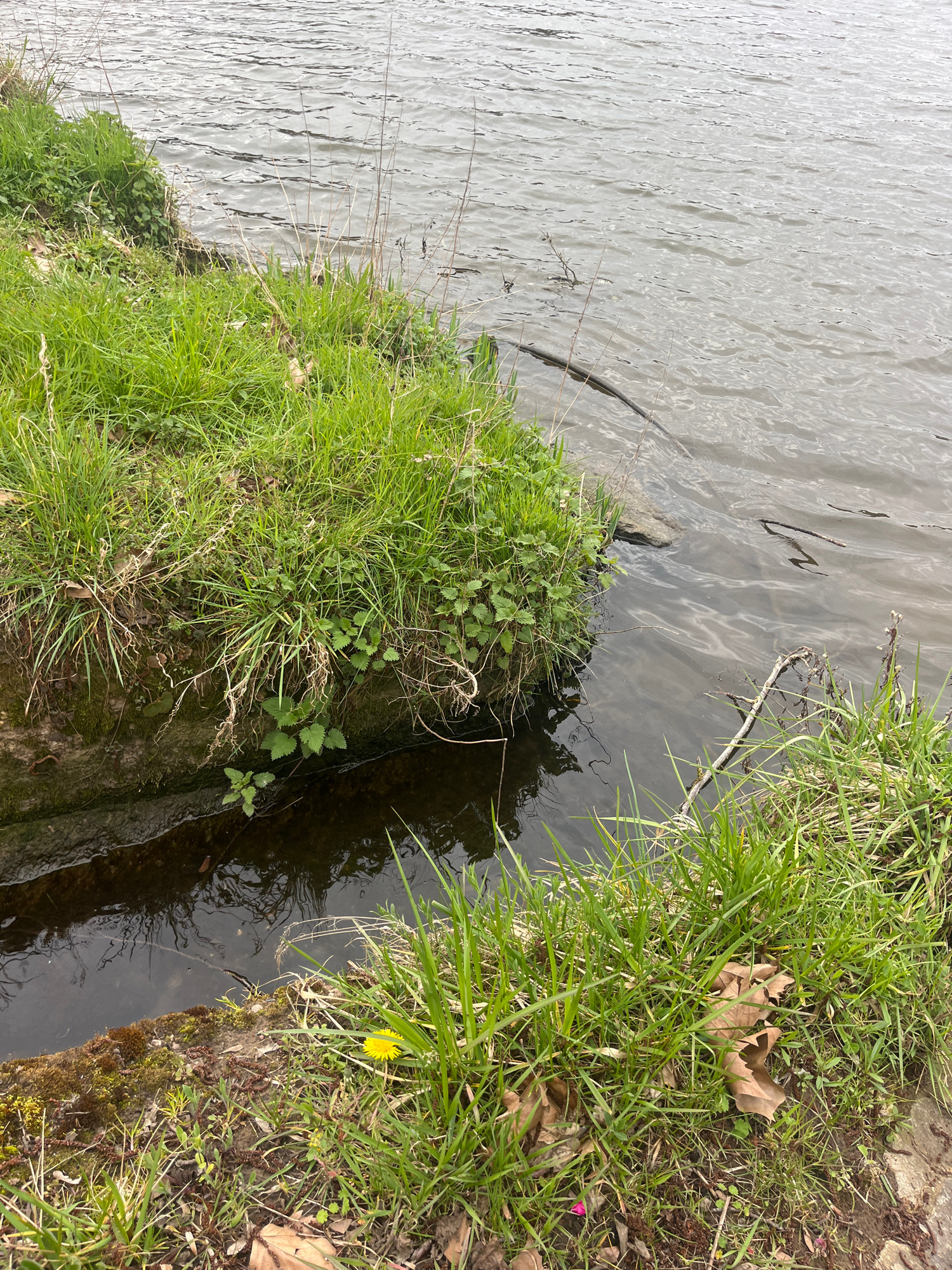 A close-up landscape photograph taken outdoors in daylight depicts the edge of a body of water, likely a river or lake. The water is dark and slightly rippled, with reflections of the surrounding envi…read more